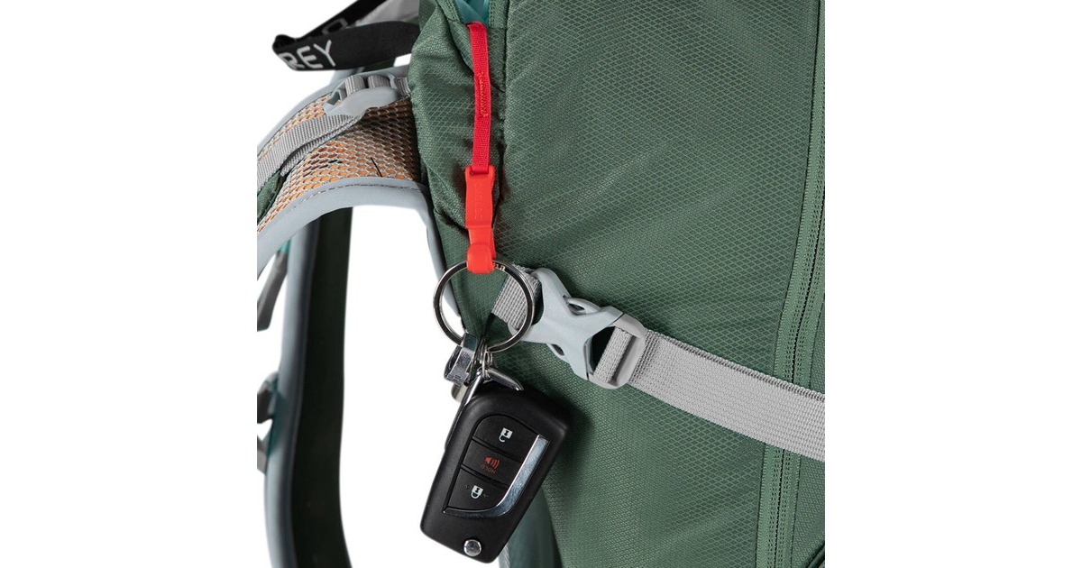 Mesh-Seitentaschen, von außen erreichbare Reißverschlusstasche mit Schlüsselbefestigung, Einschubtasche an der Front |