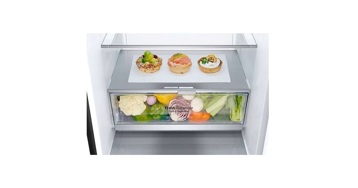 Die Kühl-/Gefrierkombination LG GBB92MCBAP ist mit einem Gesamtnutzinhalt von 384 Litern ideal für den mittleren bis größeren Haushalt geeignet und überzeugt mit zahlreichen Features. Im 277 Liter umfassenden Kühlteil mit Multi-Airflow haben Speisen und Getränke auf vier Abstellflächen aus Sicherheitsglas, davon ein variabler Glaszwischenboden, auf einem Flaschengitter sowie in vier Türfächern viel Platz, um übersichtlich gelagert zu werden. Das FRESHConverter Fach ist ein nach Bedarf regelbares Fach für die längere Lagerung von Fleisch, Fisch oder Gemüse und das FRESHBalancer Fach ist mit einem Wahlschalter ausgestattet, um je nach Bedarf die optimale Luftfeuchtigkeit für Obst und Gemüse zu regulieren und so für längere Frische zu sorgen. Das Gefrierteil des GBB92MCBAP mit Total NoFrost-Technologie und SuperGefrieren-Funktion umfasst 107 Liter und stellt drei Gefrierschubladen für Tiefkühlkost zur Verfügung. DoorCooling+ stabilisiert die Innentemperatur und kühlt schneller und gleichmäßiger als herkömmliche Kühlsysteme und LINEARCooling reduziert den Temperaturunterschied im Kühlschrank auf ±0,5°C, wodurch Lebensmittel länger frisch bleiben. Mit einem Stromverbrauch von 110 kWh im Jahr ist die GBB92MCBAP in die Energieeffizienzklasse A eingestuft.Art.-Nr.: 100040950