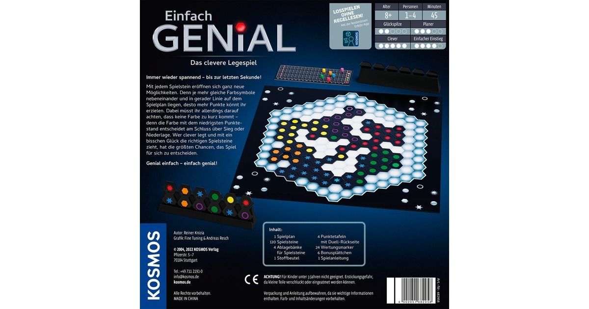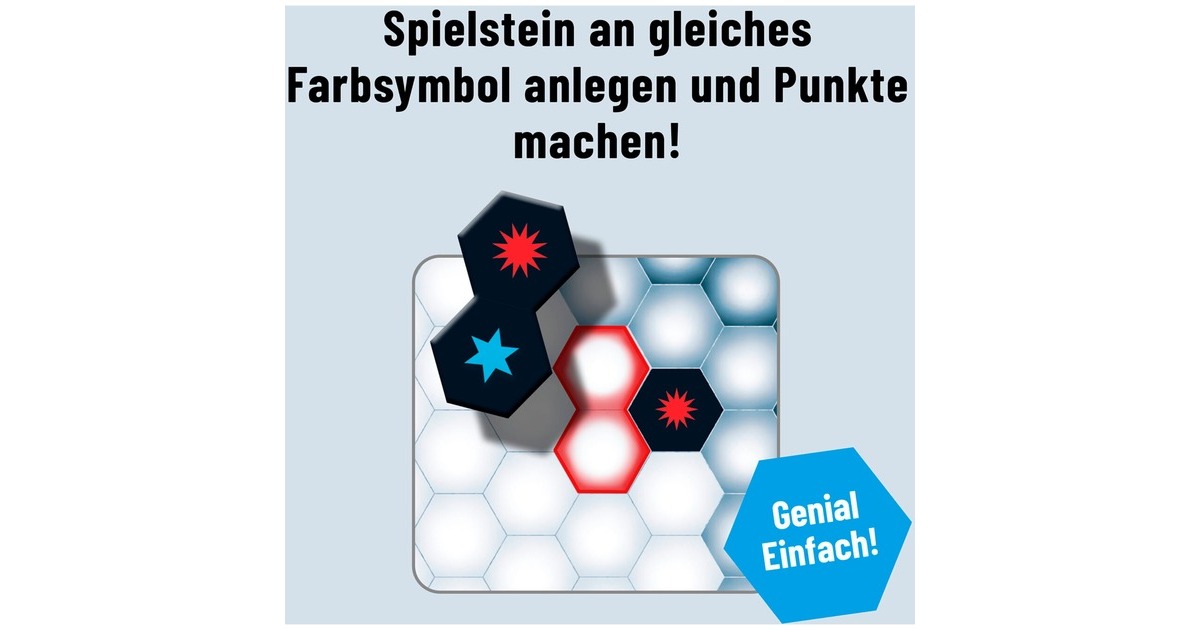 Bei diesem unglaublich spannenden Legespiel eröffnen sich mit jedem Spielstein neue Möglichkeiten. Je mehr gleiche Farbsymbole nebeneinander auf dem Spielplan ausliegen, desto mehr Punkte können die Spieler erzielen. Dabei müssen sie darauf achten, dass keine Farbe zu kurz kommt - und immer den Punktestand der Mitspieler im Auge behalten. Wer clever legt und mit ein bisschen Glück die richtigen Spielsteine zieht, hat die größten Chancen, das Spiel für sich zu entscheiden. Und wer nach dem letzten Spielzug plötzlich doch ganz hinten liegt, hat nur noch einen Gedanken: Revanche! Und schon beginnt die nächste Partie! Das Spiel ist dabei auch für zwei Spieler oder als Solospiel geeignet. Den Start erleichtert die kostenlose Erklär-App. Das Spiel ist mit und ohne App spielbar.Art.-Nr.: 1877581