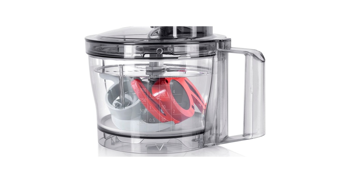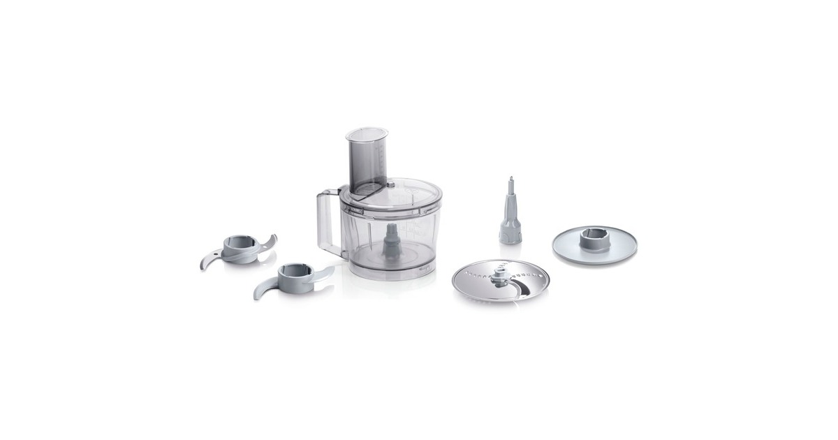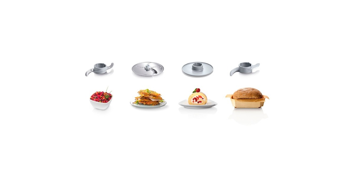 Deckel mit Einfüllhilfe, Stopfer, Schneid-Raspel-Wendescheibe, Teigwerkzeug, Schlagscheibe, Universalmesser, Messerschutzkappe |