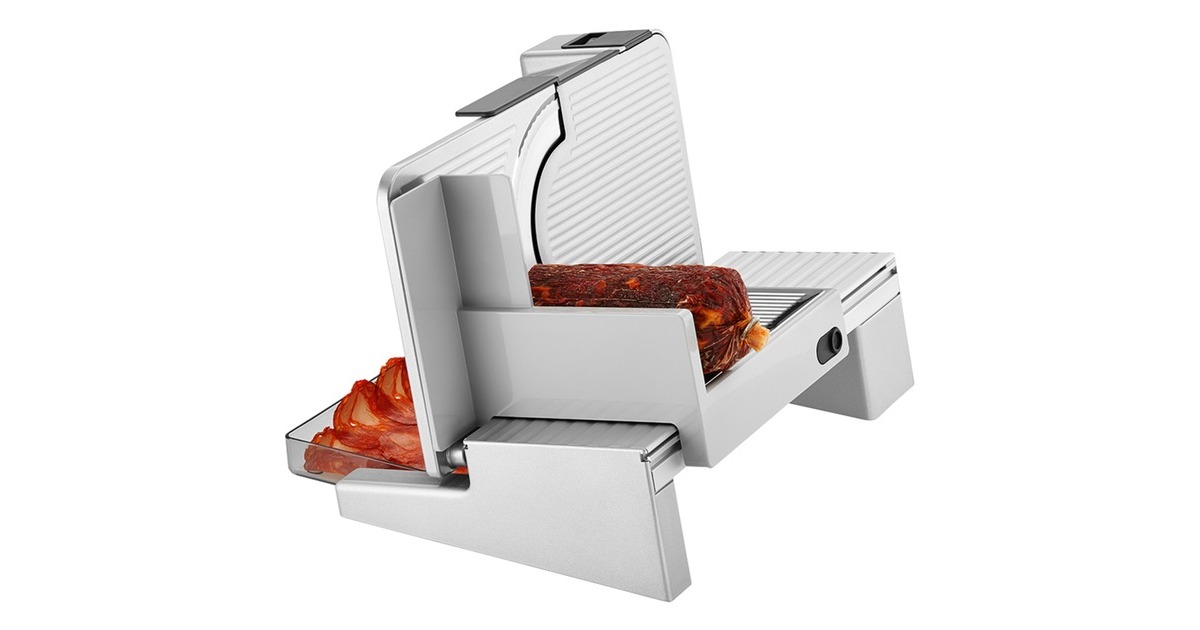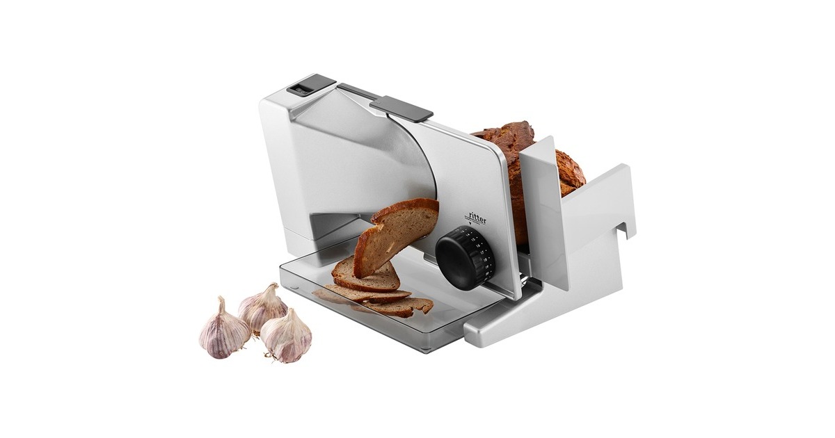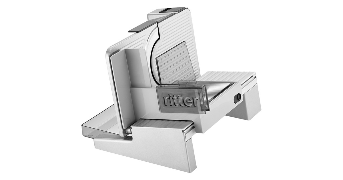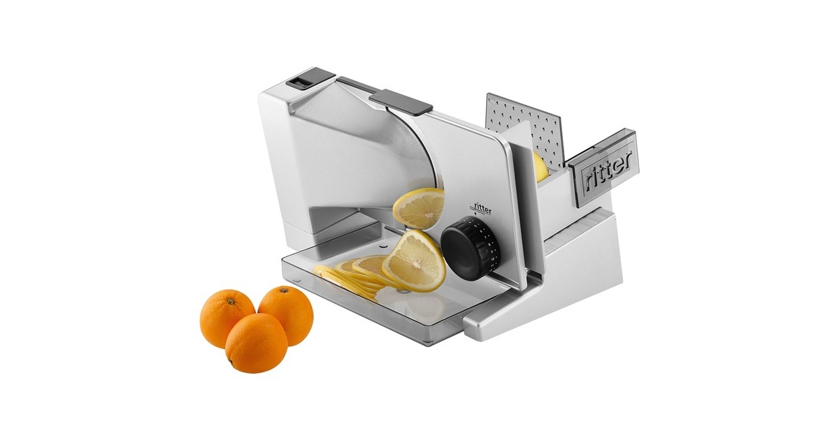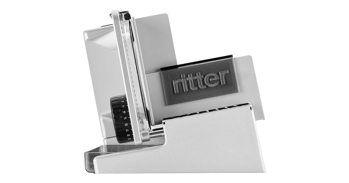 Der schräg gestellte Allesschneider serano⁵ aus der Serie premium von ritter sorgt für beste Schnittergebnisse, besonders bei dünnen Scheiben. Durch die Schrägstellung der Auflegefläche wird eine optimale Schneideposition und so ein Schneiden ohne großen Kraftaufwand ermöglicht. Die Schnittstärke ist von hauchdünn bis ca. 23mm stufenlos präzise einstellbar. Zusätzlich unterstützt der Leichtlaufschlitten den Bedienkomfort. Für häufiges Schneiden von Brot, Wurstwaren, Käse, Gemüse, Obst und mehr sorgt die Vollmetallausführung dieses Allesschneiders für hohe Stabilität, optimale Schneidergebnisse und eine lange Lebensdauer. Das Messer wird von einem äußerst durchzugsstarken und zugleich sehr leise arbeitenden 130 Watt Gleichstrommotor angetrieben, der einen Kurzbetrieb von 10 Minuten ermöglicht. Es stehen zwei Betriebsarten zur Auswahl. Für den Kurzbetrieb wird der Schalter gedrückt und bis zum Widerstand vorgeschoben. Das Rundmesser läuft, solange der Schalter in dieser Position gedrückt bleibt. Für den Dauerbetrieb wird der Schalter gedrückt und über den Widerstand hinaus geschoben, bis er einrastet. Das Rundmesser läuft in dieser Betriebsart, ohne dass der Schalter gedrückt bleiben muss, bis der Schalter zurück in die Position "0" geschoben wird. Der Schlitten kann bei Bedarf entriegelt und abgenommen werden. Das Gerät ist mit einem 17cm Ø Wellenschliffmesser ausgestattet. Der semiprofessionelle Allesschneider serano⁵ für den ambitionierten Hobbykoch fügt sich perfekt in die gehobene Küchenausstattung ein. Art.-Nr.: 1385024