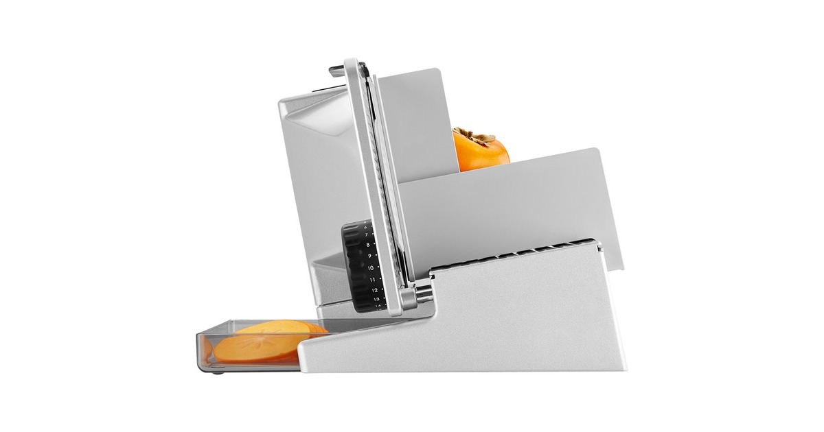 Dauerbetrieb, Momentbetrieb, Schnittstärke stufenlos einstellbar, Schneidgut-Auffangschale, abnehmbarer Schlitten |