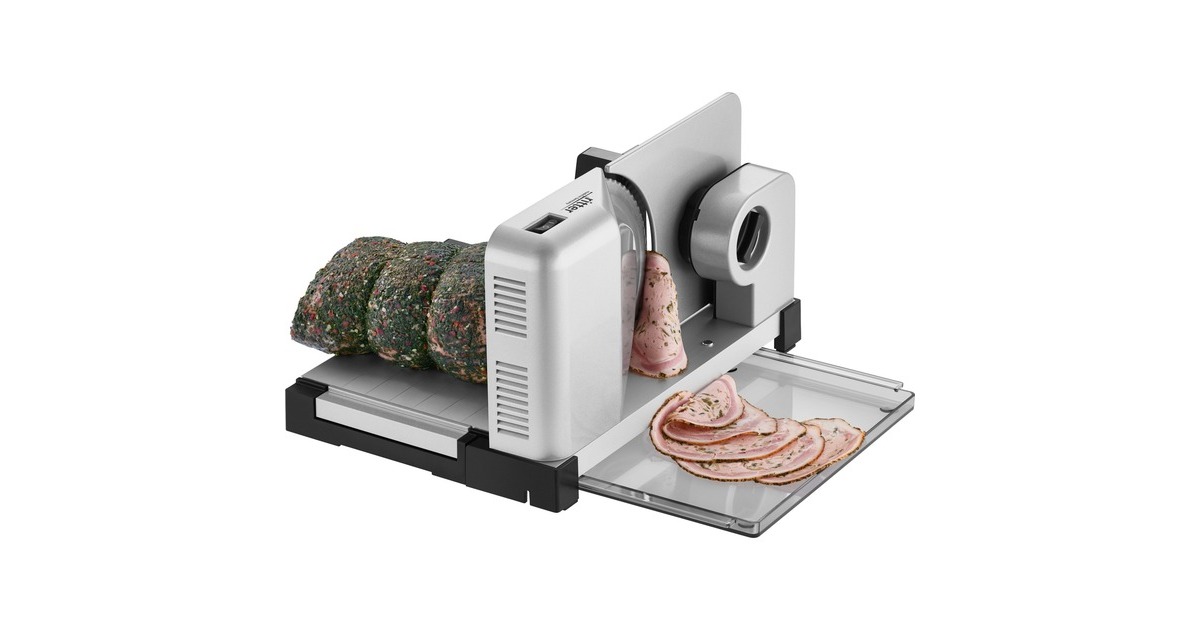 Beim klappbaren Vollmetall-Allesschneider icaro⁵ aus der Serie premium steht ganz klar die Funktion im Vordergrund, und das Gerät kann nach Gebrauch platzsparend zusammengeklappt werden. Geklappt ist der Allesschneider nur noch 10cm breit und kann praktisch und platzsparend im Schrank verstaut werden. Der icaro⁵ ist somit der perfekte Allesschneider, wenn nicht viel Platz in der Küche vorhanden ist. Auch im Gebrauch nimmt das praktische Gerät wenig Platz auf der Arbeitsplatte in Anspruch. Die Vollmetallausführung bietet besondere Stabilität, optimale Schneidergebnisse und lange Lebensdauer. Ob hauchdünn oder bis ca. 14mm dick, alles wird gleichmäßig in appetitliche Scheiben geschnitten, egal ob Brot, Wurst, Käse oder auch Gemüse. Für den perfekten "Schnitt" sorgt das Wellenschliffmesser aus rostfreiem Edelstahl. Der Schneidgutschlitten lässt sich zur einfachen Reinigung leicht entriegeln und abnehmen. Auch übergroßes Schneidgut ist durch die breite Auflegefläche aus Metall kein Problem für den Allesschneider icaro⁵. Es stehen zwei Betriebsarten zur Auswahl. Für den Kurzbetrieb wird der Schalter gedrückt und bis zum Widerstand vorgeschoben. Das Rundmesser läuft, solange der Schalter in dieser Position gedrückt bleibt. Für den Dauerbetrieb wird der Schalter gedrückt und über den Widerstand hinaus geschoben, bis er einrastet. Das Rundmesser läuft in dieser Betriebsart, ohne dass der Schalter gedrückt bleiben muss, bis der Schalter zurück in die Position "0" geschoben wird. Angetrieben wird der icaro⁵ durch einen kraftvollen 65 Watt Eco-Motor. Hochwertige Materialien und eine perfekte Verarbeitung sorgen beim icaro⁵ für eine hohe Lebensdauer, ein ideales Gerät für alle, die Wert auf eine praktische und hochwertige Maschine legen.Art.-Nr.: 1834790