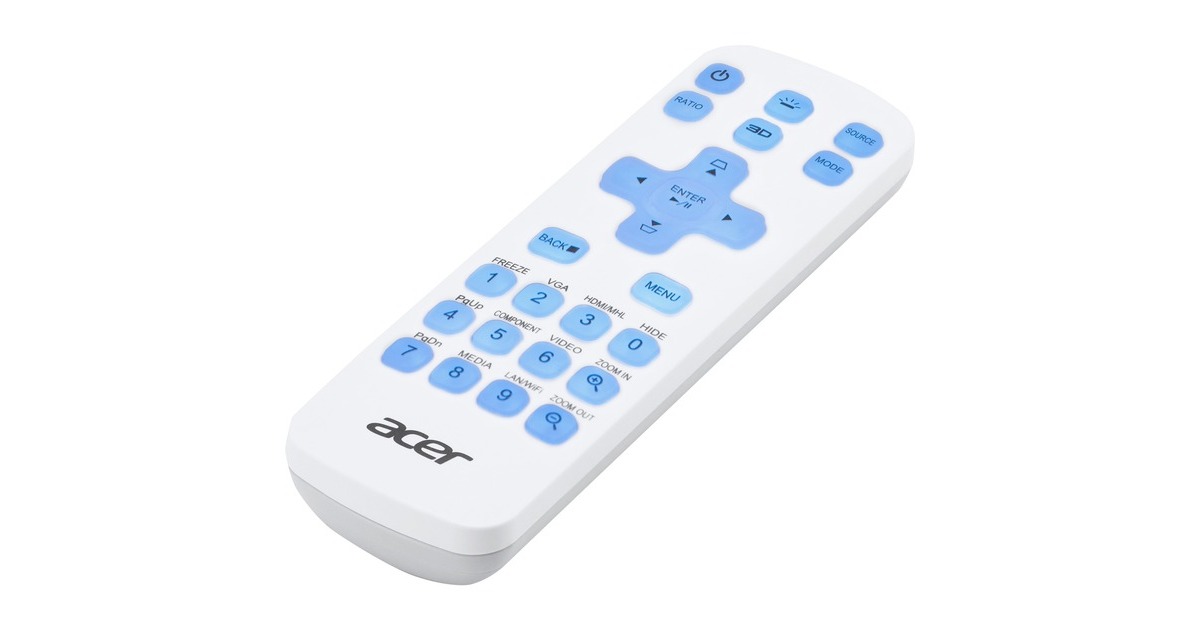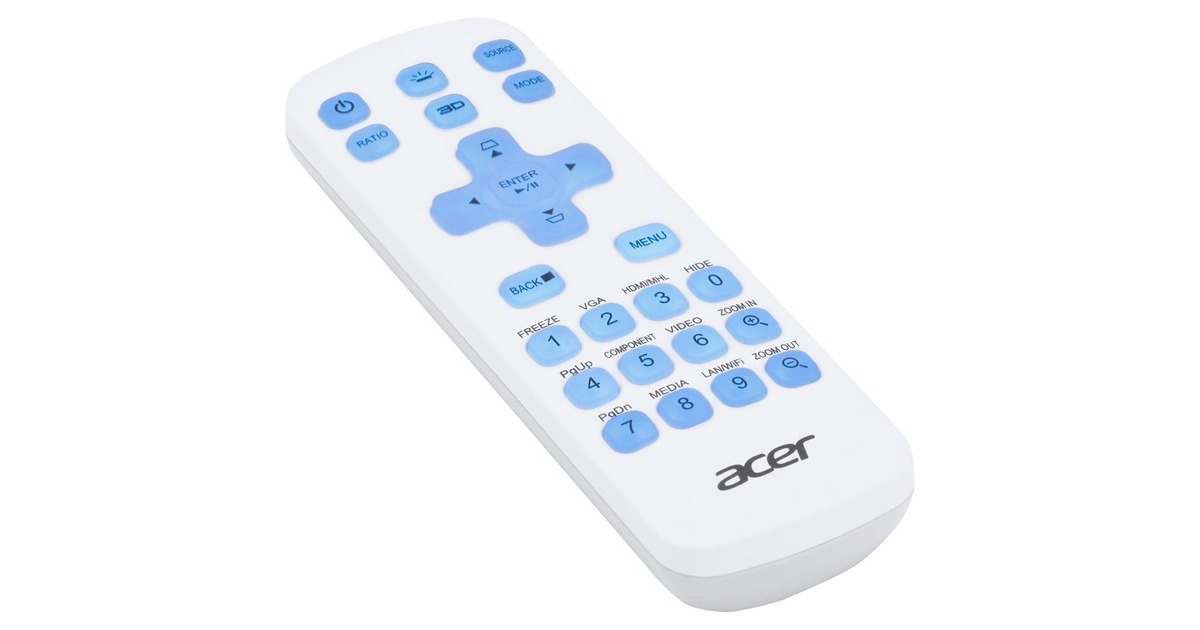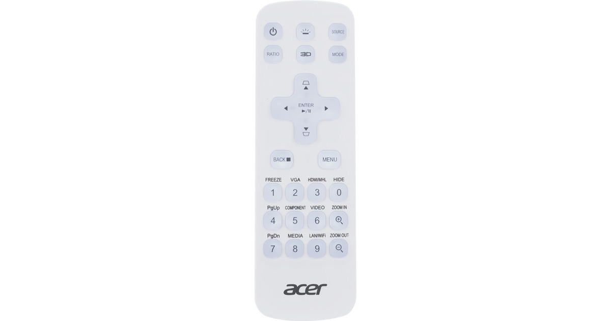 Mit der universellen Consumer Fernbedienung von acer kann man verschiedene Projektoren von acer steuern und dabei eine Reihe an nützlichen Funktionen aktivieren. Die Fernbedienung besitzt insgesamt 25 Tasten, die alle hintergrundbeleuchtet sind. Neben üblichen Tasten wie Quelle, Vor/Zurück und die Navigationstasten, besitzt die Fernbedienung eine Taste um die 3D-Funktion ein- oder auszuschalten, den Bildschirm einzufrieren oder auch direkt zu schwärzen. Art.-Nr.: 1490536