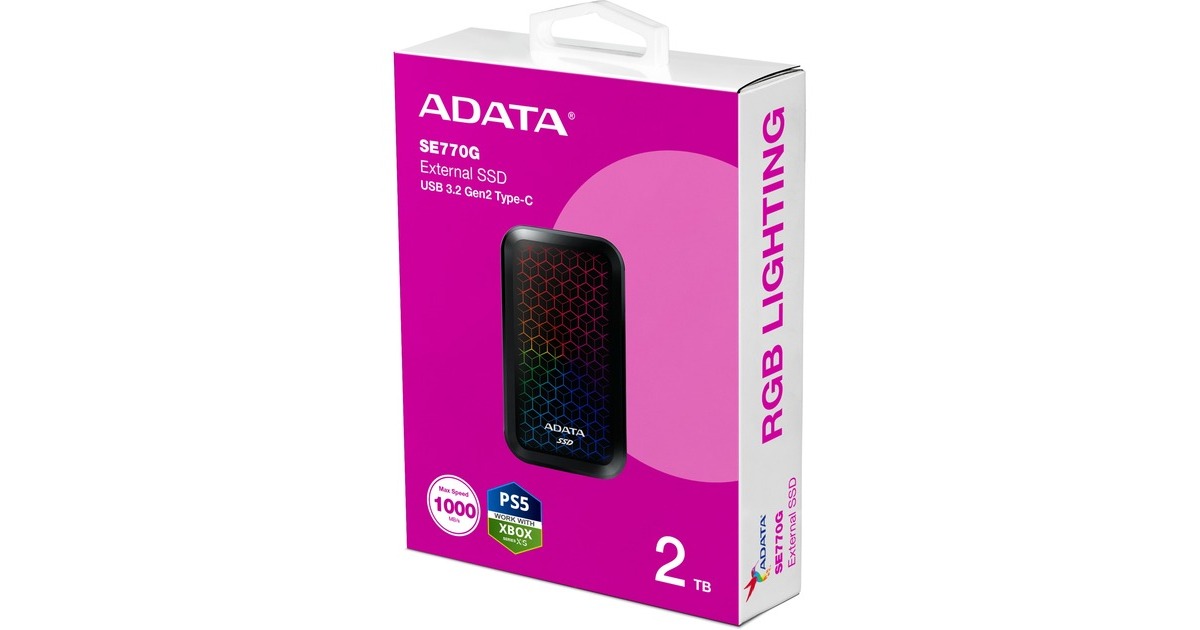 Die externe Solid-State Drive (SSD) SE770G von ADATA überzeugt mit Lese-/Schreibgeschwindigkeiten von 1000/800 MB/s und Unterstützung von USB 3.2 Gen 2 Typ-C. Damit ist diese externe SSD das optimales Speichergerät für Video- und Fotobearbeitung sowie für mobiles Gaming. Abgesehen von der Leistung glänzt die SE770G durch den unverwechselbaren RGB-Lichteffekt.Art.-Nr.: 100011103