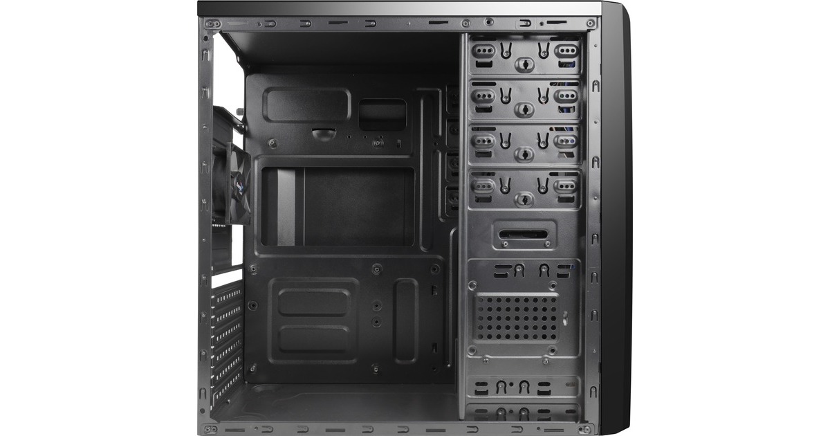 1x 120-mm-Lüfter im Seitenteil einbaubar, schwarze Innenlackierung, Einbaumöglichkeiten für Grafikkarten bis zu 350 mm möglich, ohne Frontlüfter sind Grafikkarten von bis zu 375 mm einbaubar |