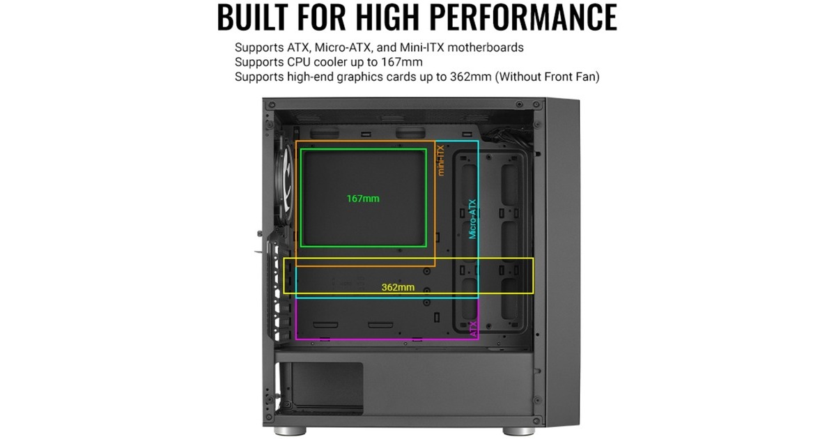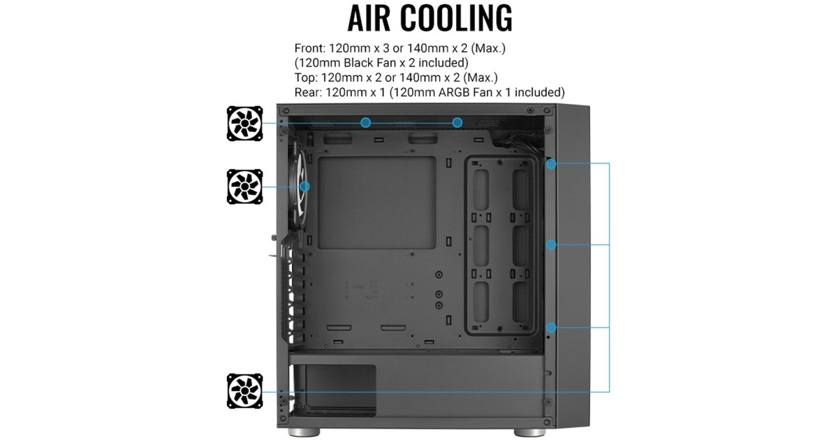 Das Aerocool Skribble bietet Front- und Seitenteile aus gehärtetem Glas mit ARGB-Beleuchtung und die Möglichkeit des Anschlusses von bis zu sechs adressierbaren RGB-Lüftern mit Hilfe des 6-Port ARGB Control Hub. Das Gehäuse besitzt einen 120-mm-ARGB-Lüfter mit PWM-Kompatibilität und ist ausgestattet mit 2 schwarzen 120-mm-Lüftern in der Front des Gehäuses. Die Belüftungsöffnungen in der Frontblende sorgen für einen verbesserten Luftstrom. Die vertikale GPU-Montage ist dank der zwei vertikalen PCIe-Steckplätzen möglich. Es unterstützt Flüssigkeitskühlung in der Vorder-, Ober- und Rückseite des Gehäuses sowiet Luftkühlung in der Vorder-, Ober- und Rückseite des Gehäuses.Art.-Nr.: 1871536