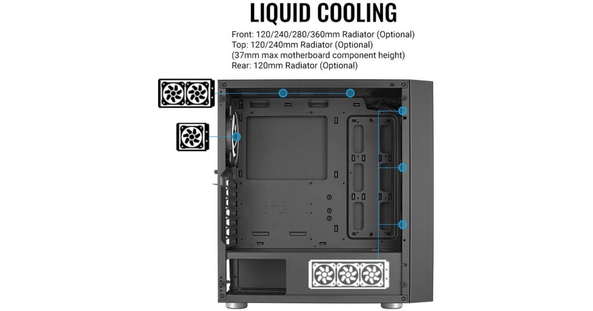 Front: 120/240/280/360 mm, Top: 120/240 mm Radiator (Mainboard-Komponentenhöhe maximal 37 mm), Rückseite: 120 mm |