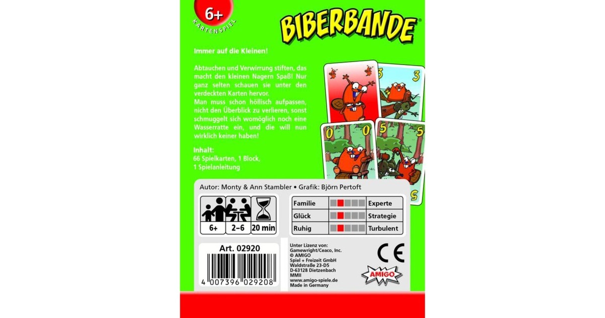 Abtauchen und Verwirrung stiften, das macht den kleinen Nagern Spaß. Das Ziel ist klar: Biberkarten mit möglichst niedrigen Werten zu bekommen. Jeder Spieler hat vier Karten verdeckt vor sich liegen, aber nur zwei davon darf er sich zu Beginn ansehen. Danach gibt es nur noch wenige Möglichkeiten, herauszufinden was auf der Vorderseite abgebildet ist. Ist es ein dösender Biber mit niedrigem Zahlenwert oder eine fiese Wasserratte mit hohem Wert, die man loswerden will? Spezielle Sonderkarten erlauben es, sich während des Spiels die ein oder andere Karte anzusehen oder eine schlechte Karte seinen Mitspielern zuzuschieben.Art.-Nr.: 1353258