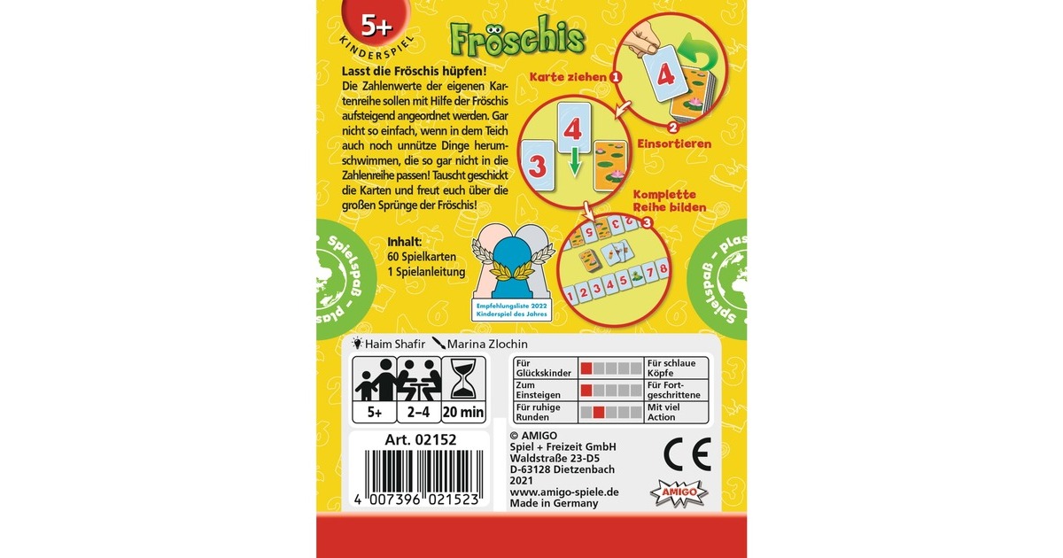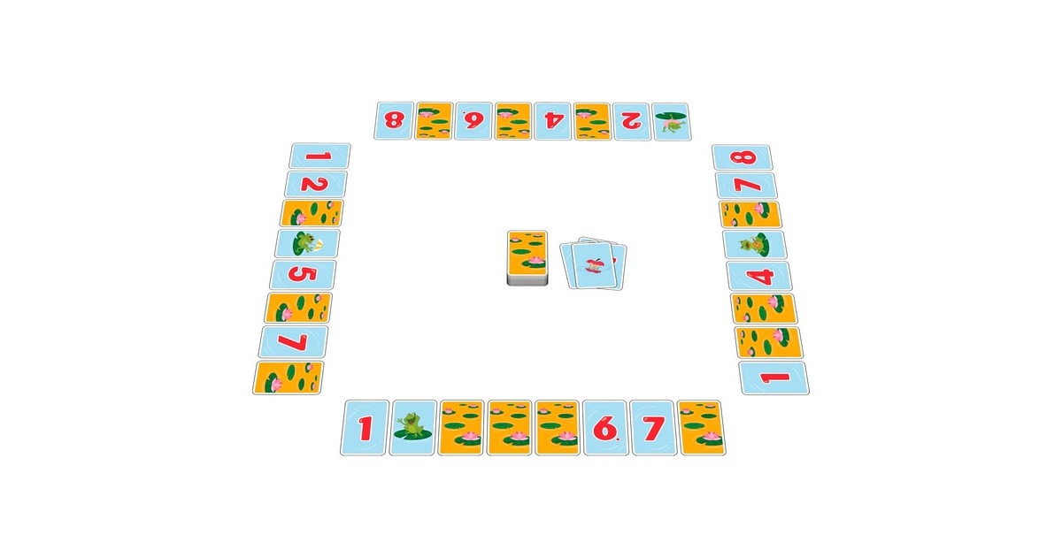Die Fröschis hüpfen los! 2-4 Spieler sollen die Zahlenwerte der eigenen Kartenreihe mit Hilfe der Fröschis aufsteigend anordnen. Gar nicht so einfach, wenn in dem Teich auch noch unnütze Dinge herumschwimmen, die so gar nicht in die Zahlenreihe passen. Da müssen geschickt die Karten getauscht werden - dann kann man sich über die grossen Sprünge der Fröschis freuen.Art.-Nr.: 1919248