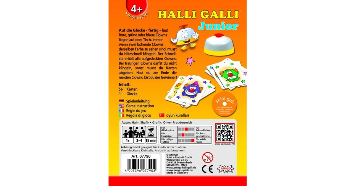 Der Riesenspaß mit der Glocke, jetzt auch für die Allerkleinsten. Wie schon beim furiosen Dauerbestseller Halli Galli geht es auch in der Junior-Ausgabe konzentriert und blitzschnell zur Sache. Sobald zwei gleichfarbige Clowns zu sehen sind, gibt es kein Halten mehr und alle Hände rasen auf die Glocke zu. Aber nicht immer ist es so, wie es scheint. Manchmal sind die Clowns ganz traurig, und dann müssen die Finger still bleiben.Art.-Nr.: 1353243