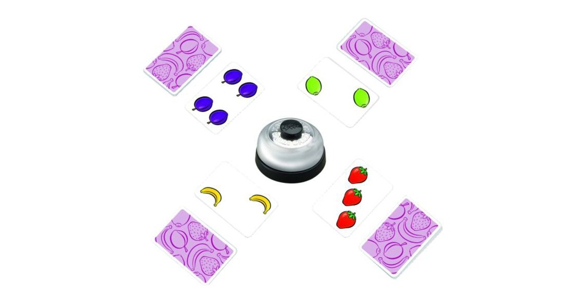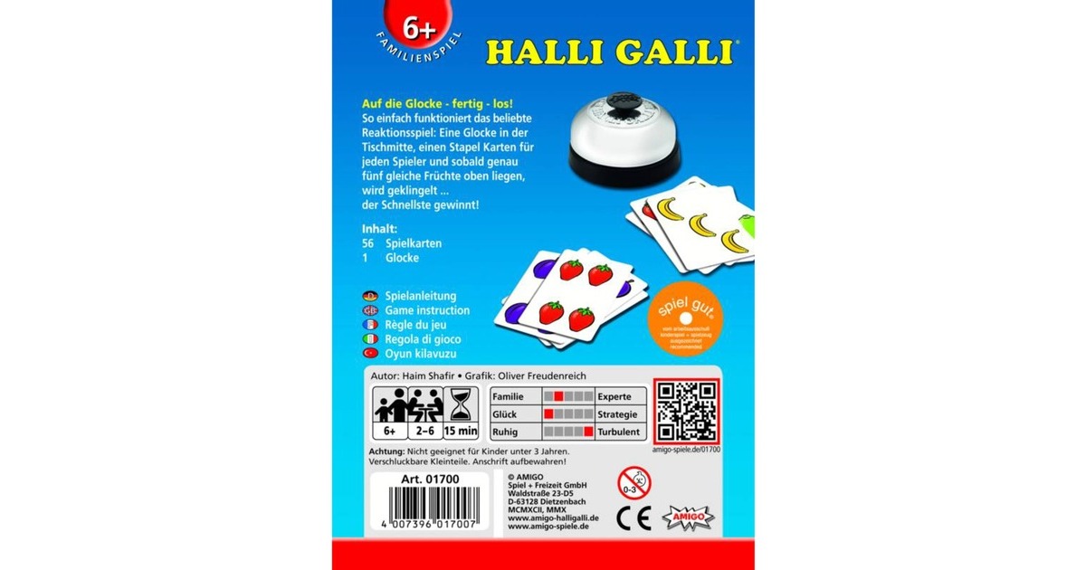 56 Karten, 5 Früchte, 1 Glocke. Da haben wir den Salat. Ein großer Obstsalat mit Bananen, Erdbeeren, Limonen und Pflaumen, das ist Halli Galli: Schnelligkeit und ein gutes Auge sind hier Trumpf. Reihum deckt jeder Spieler eine Karte auf. Sobald auf allen offenen Karten zusammen genau fünf Früchte einer Sorte liegen, gewinnt der Spieler, der zuerst klingelt, alle offenliegenden Ablagestapel. Wer am Ende die meisten Karten erklingelt hat, ist Sieger. Halli Galli ist einfach großer Spielspaß für Groß und Klein, setzt auf Reaktionsvermögen und Geschwindigkeit und schult nebenbei noch ein schnelles Auge. Es begeistert mittlerweile seit 25 Jahren Familien und Freunde.Art.-Nr.: 1353281