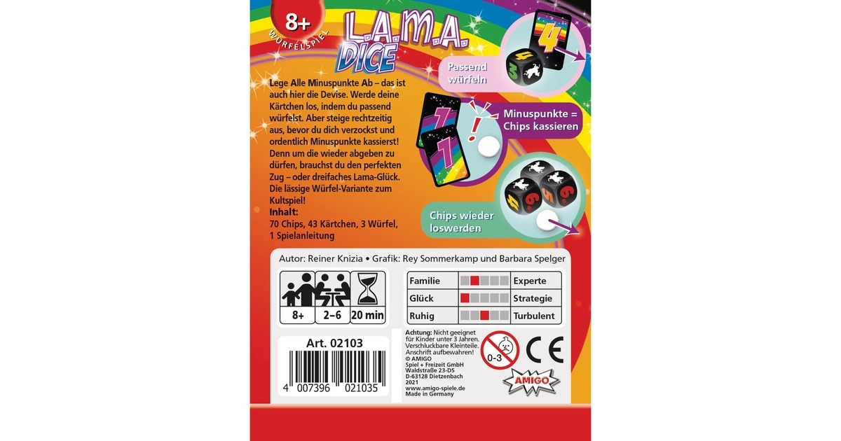 Die Devise bei "LAMA Dice" ist altbekannt: Alle Minuspunkte müssen weg - und dazu muss passend gewürfelt werden. Doch Vorsicht: Wer nicht rechtzeitig aussteigt, verzockt sich und kassiert neue Minuspunkte! Und um die wieder loszuwerden, braucht man einen perfekten Zug - oder mehrfaches Lama-Glück. Dieses Spiel baut auf der von "LAMA" bekannten Grundidee auf und erweitert sie mit neuen Elementen.Art.-Nr.: 1919251