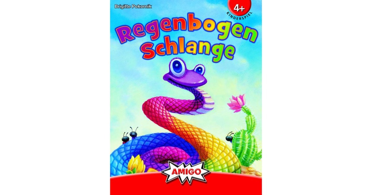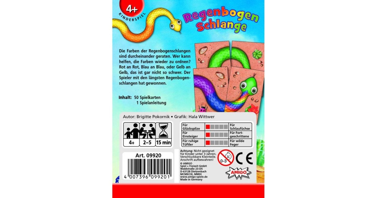 Die Farben der Schlange sind durcheinander geraten. Aufgabe der Spieler ist es, die Farben wieder zu ordnen und dabei möglichst lange Regenbogenschlangen zu bilden. Wer an der Reihe ist, zieht eine Karte vom Stapel und legt sie passend an eine andere Schlangen-Karte. Rot an Rot, Blau an Blau, oder Gelb an Gelb. Dabei darf die Karte auch gedreht werden. Es gibt drei verschiedene Arten von Karten: Schlangenköpfe, Schlangenmittelteile und Schlangenschwänze. Eine vollständige Schlange besteht immer aus einem Kopf, einem Schwanz und mindestens einem Mittelteil. Wer eine Schlange fertig stellen kann, darf sie vor sich ablegen. Zieht man keine passende Karte zum Anlegen, wird diese separat und offen auf den Tisch gelegt. So entstehen neue Regenbogenschlangen. Das Spiel endet, wenn die letzte Karte aus dem Fächer gezogen wurde. Der Spieler mit den buntesten und längsten Regenbogenschlangen hat gewonnen. Das beliebte Farblegespiel für Kinder ab 4 Jahren ist ein echter Kinderspielklassiker, bei dem Kinder spielerisch die Grundfarben kennen und unterscheiden lernen.Art.-Nr.: 1353256