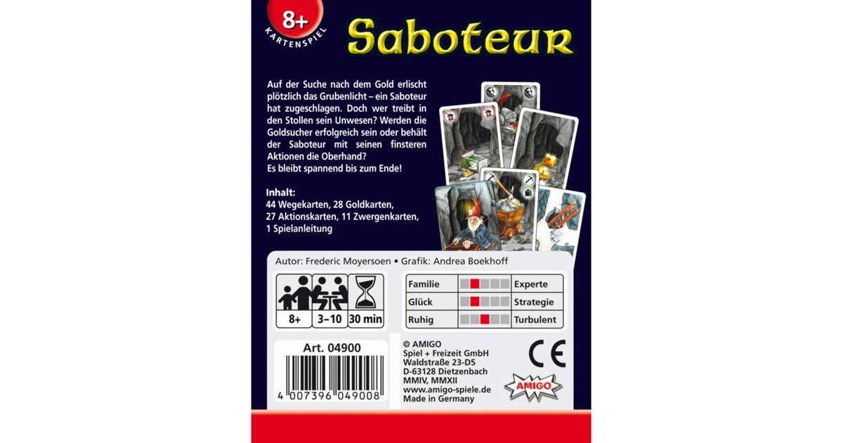 Als Goldsucher begeben sich die Spieler im Bergwerk auf die Jagd nach dem wertvollen Metall. Plötzlich zerbricht eine Spitzhacke und das Grubenlicht erlischt. Ein Saboteur hat zugeschlagen. Doch wer treibt in dem Stollen sein Unwesen? Werden die Goldsucher erfolgreich sein oder behält der Saboteur mit seinen finsteren Aktionen die Oberhand? Es bleibt spannend bis zum Ende! Nach drei Runden gewinnt der Spieler mit den meisten Goldstücken.Art.-Nr.: 1353244