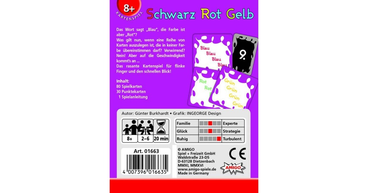 Ist grün nun rot oder blau? Oder doch gelb? Solche Fragen muss man sich immer wieder stellen, wenn man eine Partie Schwarz Rot Gelb spielt. Denn bei diesem Kartenspiel geht es darum, schnell und gezielt eine Reihe von Karten auszulegen, bei der die Nachbarkarten in Farbe, Farbwort und Anzahl der Wörter nie übereinstimmen dürfen. Doch das ist leichter gesagt, als getan, denn manchmal sagt die Karten-Farbe Rot, das Wort auf der Karte dagegen Gelb! Da sind ein gutes Auge und Schnelligkeit gefragt, wenn man am Ende mit der längsten Kartenreihe siegen will.Art.-Nr.: 1352881