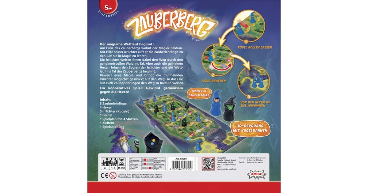 Der magische Wettlauf beginnt! Am Fuß des Zauberbergs wohnt der Magier Balduin. Mit Hilfe seiner Irrlichter ruft er die Zauberlehrlinge zu sich, um sie in Magie zu lehren. Die Irrlichter weisen ihnen dabei den Weg durch den geheimnisvollen Wald ins Tal. Aber auch die gemeinen Hexen folgen den Spuren der Irrlichter - ein Wettlauf ins Tal des Zauberbergs beginnt. Beweist nun eure Magie und bringt die murmelnden Irrlichter möglichst geschickt auf den Weg, so dass sie nur euch Zauberlehrlingen den Weg zu Balduin weisen. Dieses magische Brettspiel für Kinder ab 5 Jahren erhielt den Preis "Kinderspiel des Jahres 2022".Art.-Nr.: 1857303