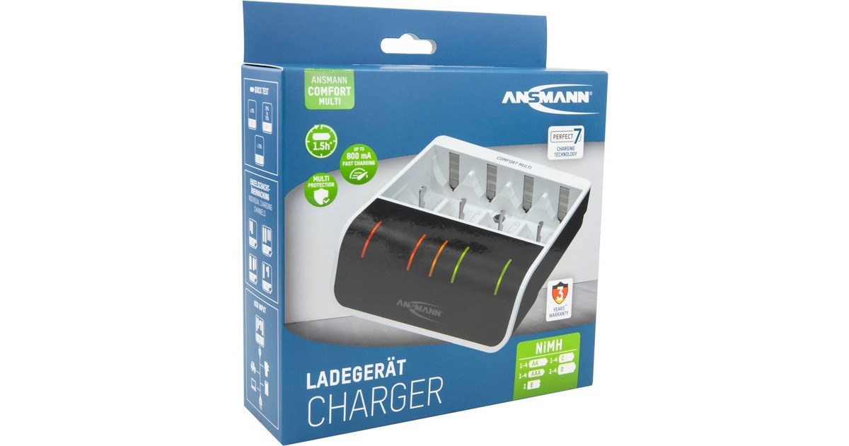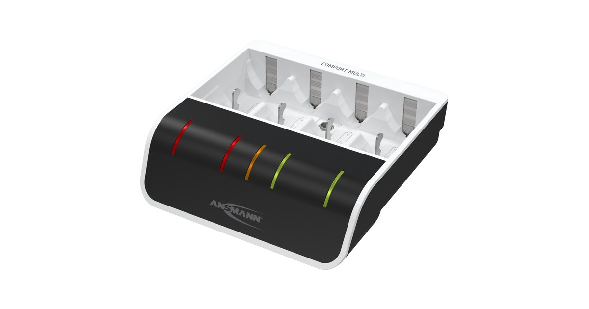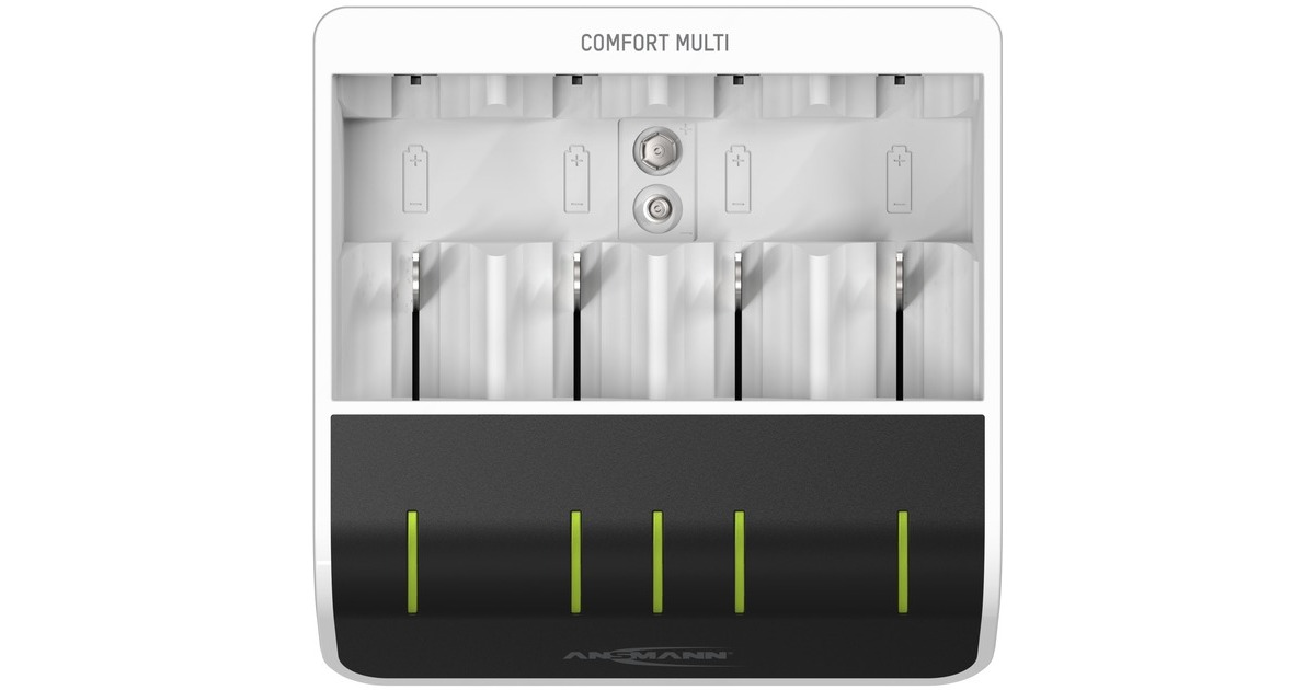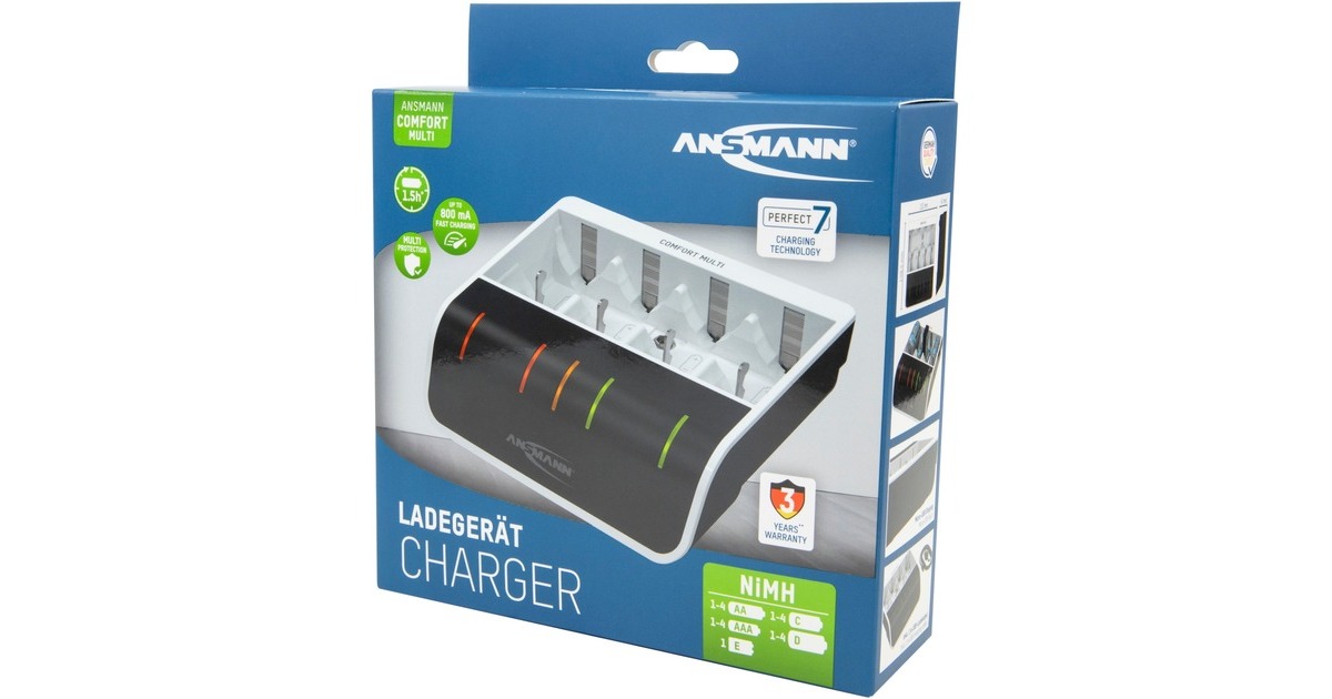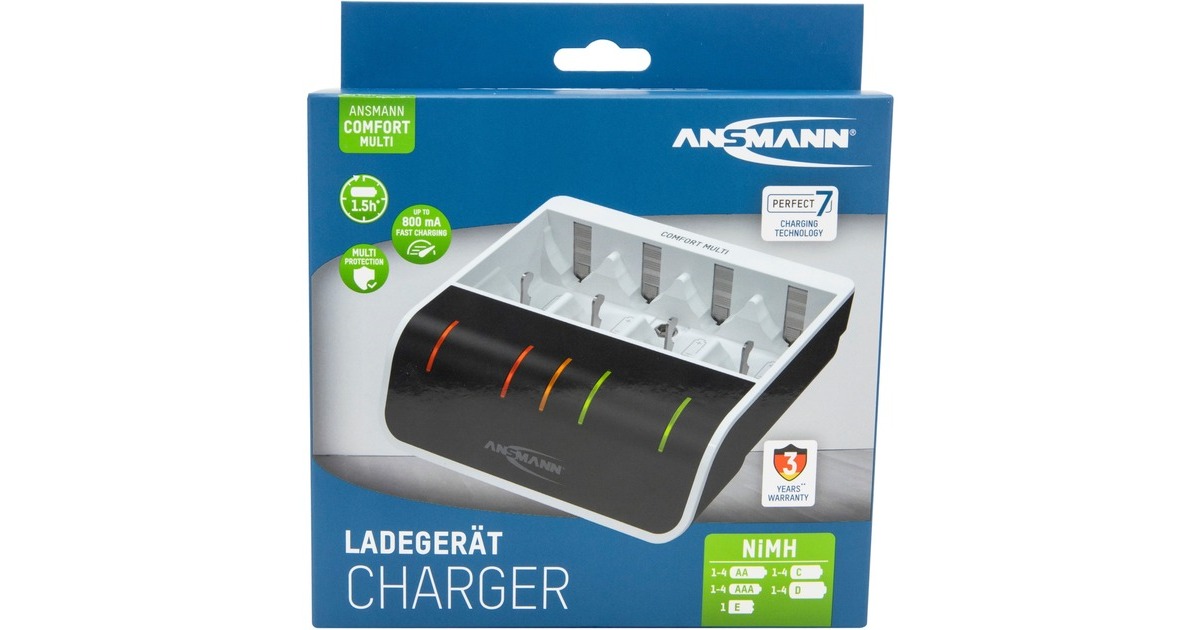 Dank der intelligenten "PERFECT 7"-Ladetechnologie sorgt das Comfort Multi Ladegerät von Ansmann präzise und schnell für volle Akkus. Die vollautomatische 7-Stufen-Ladung maximiert die Lebensdauer und die Leistung der Akkus erheblich. Das innovative Ladeverfahren basiert auf neuesten Erkenntnissen aus der Akku-Forschung und berücksichtigt eine Vielzahl von individuellen Parametern. Die übersichtliche Statusanzeige ermöglicht eine intuitive Bedienung. Dank der einfachen 3-farbige LED-Anzeige ist das Ablesen des jeweiligen Zellen-Status kinderleicht. In Kombination mit einer geeigneten Powerbank kann das Comfort Multi auch komplett mobil betrieben werden und ist somit sehr flexibel einsetzbar. Nicht nur über eine Powerbank, sondern auch über jeglichen anderen USB-Anschluss lässt es sich anschließen. Das intelligente Schnellladegerät kann bis zu vier Akkus der Größen Mignon, Micro, Baby, Mono sowie einen 9V E-Block laden. Die Rundzellen-Akkus können dabei gemischt in einen beliebigen Ladeschacht eingelegt werden. Jede Zelle wird während des Ladevorgangs einzeln überwacht und individuell bis zur maximalen Kapazität geladen.Art.-Nr.: 1846947