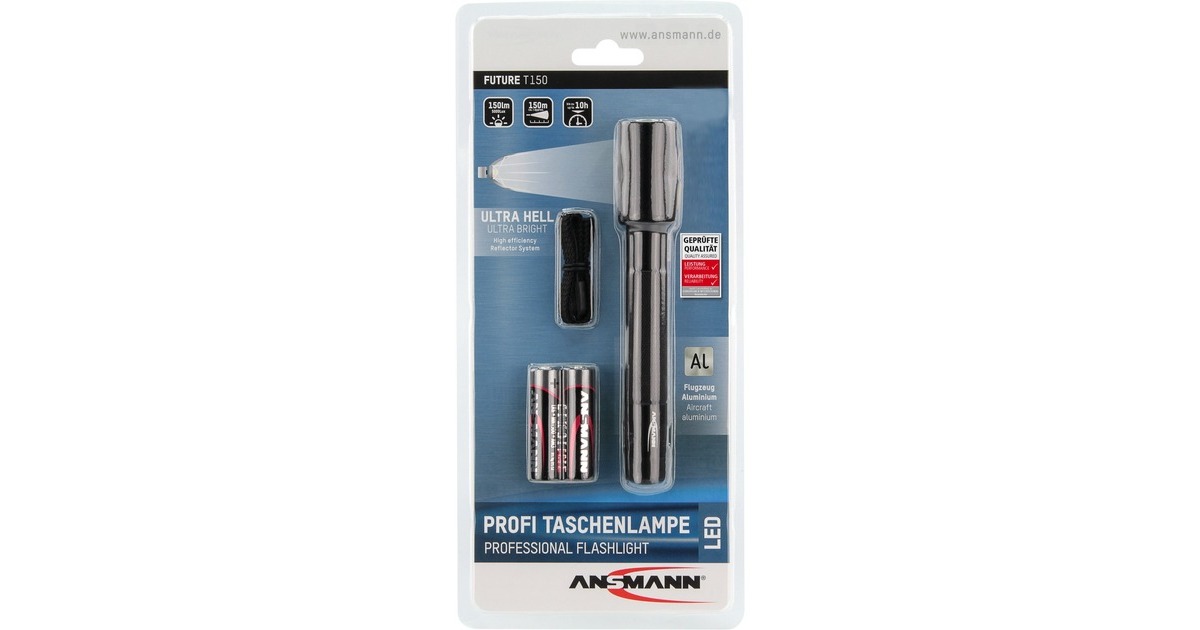 Die Future T150 ist eine professionelle Taschenlampe mit kompakten Abmessungen und einer griffigen Oberfläche. Sie wird über einen großen Schalter an der Endkappe bedient und ist damit ideal für den Einhandbetrieb auch mit Handschuhen geeignet. Die Future T150 ist gegen Staub und Spritzwasser nach IP54 geschützt und bis zu einer Fallhöhe von einem Meter stoßfest. Sie erreicht eine Helligkeit von bis zu 150 Lumen bei einer Leuchtdauer von bis zu 10 Stunden. Leuchtweiten von bis zu 150 Meter sind durch ein hocheffizientes Reflektorsystem möglich.Art.-Nr.: 1329871