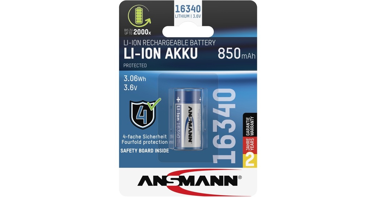 Der Ansmann Li-Ion Akku 16340 850 mAh eignet sich für den Einsatz in modernen LED-Taschenlampen, Stirnlampen oder E-Zigaretten. Die integrierte Schutzbeschaltung schützt vor Überladung, Überlast, Kurschluss und Tiefentladung. Der Akku bietet eine sehr geringe Selbstentladung und hohe Energieeffizient.Art.-Nr.: 1847043
