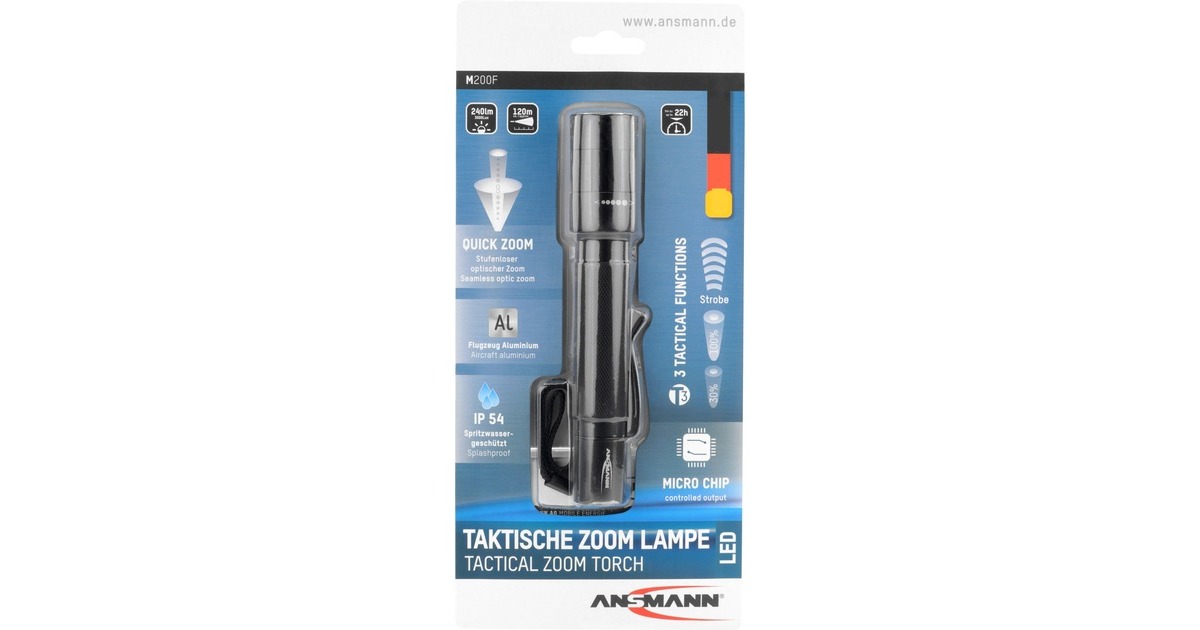 Die M200F von Ansmann ist eine Taschenlampe für den professionellen Einsatz. Ihr Aluminiumgehäuse ist nach IP54 geschützt, besonders griffig und lässt sich auch mit Handschuhen und einhändig gut bedienen. Über den Endkappenschalter lassen sich drei Funktionen (100% Leuchtkraft, 30%, Strobe) aktivieren. Die CREE-LED mit einer Leistung von 5 Watt kommt auf eine Leuchtdauer von bis zu 22 Stunden im 30%-Modus und eine Leichtweite von bis zu 120 Metern. Diese Taschenlampe lässt sich durch Drehen am Lampenknopf stufenlos fokussieren.Art.-Nr.: 1401920