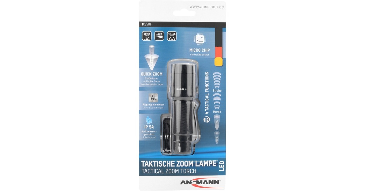 Die M250F von Ansmann ist eine Taschenlampe für den professionellen Einsatz. Ihr Aluminiumgehäuse ist nach IP54 geschützt, besonders griffig und lässt sich auch mit Handschuhen und einhändig gut bedienen. Über den Endkappenschalter lassen sich vier Funktionen (100% Leuchtkraft, 30%, Strobe, Morsefunktion) aktivieren. Die CREE-LED mit einer Leistung von 5 Watt kommt auf eine Leuchtdauer von bis zu 10 Stunden im 30%-Modus und eine Leichtweite von bis zu 150 Metern. Diese Taschenlampe lässt sich durch Drehen am Lampenknopf stufenlos fokussieren.Art.-Nr.: 1401921