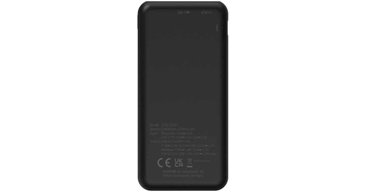 Die praktische Powerbank 10000 mAh PB218 wireless von ANSMANN im eleganten Design ist leicht, kraftvoll und immer dabei. Aufgrund der kompakten Bauweise findet der leichte Stromspeicher in jeder Jacken-, Hosen- oder Handtasche Platz. Die ANSMANN Powerbank hat neben dem USB-A Port einen Typ C und einen Micro-USB Port integriert. Über die USB- oder Typ C Anschlüsse wird Energie per Ladekabel an Ihr Smartphone und/oder Tablet abgegeben. Dabei unterstützen alle Ports schnellladefähige Endgeräte mit schnellstmöglicher Ladung. Dank des neuartigen Power Delivery (PD) Protokolls ist mit dem Typ C Anschluss auch das Laden von Notebooks möglich. Über den Micro-USB-Anschluss oder dem Typ C Anschluss kann der Akku ganz bequem mit einem handelsüblichen USB-Ladegerät an der Steckdose wieder aufgeladen werden. Mit einem Schnellladegerät (QC oder PD) USB-C Eingang lässt sich die Powerbank besonders schnell befüllen. Mit einer Ladekapazität von 10000 mAh und einer Ausgangsleistung von maximal 3 A lädt das kleine Kraftpaket mobile Geräte mehrfach wieder auf. Der hochwertige Zusatz-Akku im stabilen Gehäuse ist kompatibel für alle gängigen USB-Geräte wie Smartphones, Tablets, Mobiltelefone, MP3-Player, Navigationsgeräte und viele weitere Anwendungen, die über USB aufgeladen werden können. Zusätzlich verfügt die Powerbank über einen Wireless Ausgang. Dieser ist zum Qi-Standard kompatibel. Passende Qi-fähige Endgeräte können bequem durch einfaches Auflegen mit bis zu 10 Watt geladen werden. Der eingebaute Überladeschutz sorgt dafür, dass die Powerbank nach erfolgreicher Ladung den Ladevorgang automatisch beendet. Der Tiefentladeschutz schaltet die Powerbank ab, sobald die Spannung der Powerbank beim Laden eines angeschlossenen Gerätes unter einen bestimmten Wert sinkt und verhindert somit eine Schädigung des Akkus und des Produktes. Der Kurzschlussschutz rundet die Sicherheitsfunktionen ab und sorgt neben der Abschaltautomatik für maximale Sicherheit.Art.-Nr.: 1784267