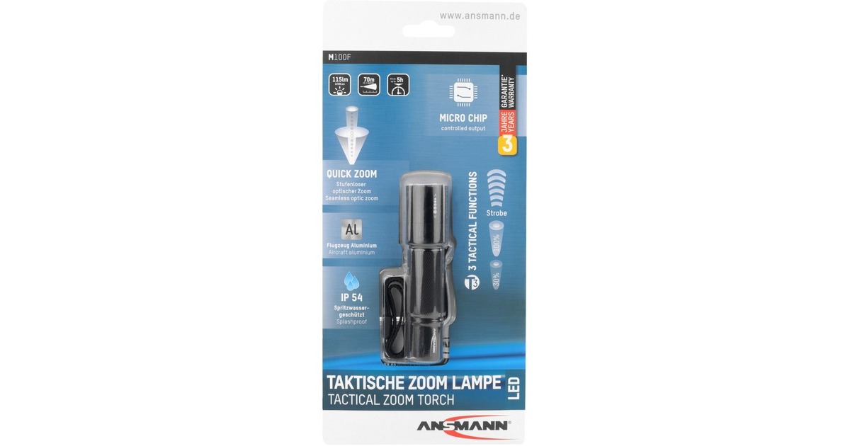 Die Taschenlampe M100F verfügt über ein stabiles Aluminiumgehäuse und ist nach IP54 gegen äußere Einflüsse geschützt. Sie erreicht in zwei Leuchtstufen eine Lichtstärke von bis zu 155 Lumen und spendet in der niedrigeren Leuchtstufe bis zu 5 Stunden Licht. Dabei verfügt sie über eine einfach über den Lampenkopf fokussierbare LED. Mit im Lieferumfang sind außerdem ein Tragegurt und ein Gürtelclip. Neben zwei Leuchtfunktionen ist auch eine Stroboskop-Funktion mit an Bord.Art.-Nr.: 1847077