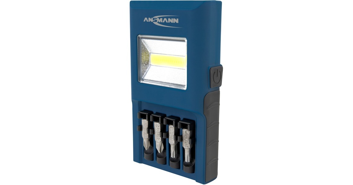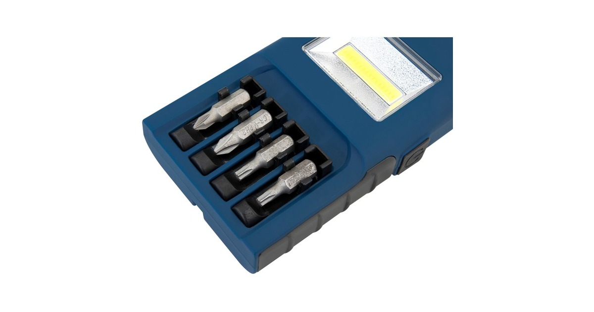 Die WL180B mit Bithalter ist nicht nur eine robuste Arbeitsleuchte mit COB-LED und einer Leistung von bis zu 200 Lumen. Sie bietet zusätzlich zum Haltehaken an der Rückseite und einem Befestigungsmagneten auch einen praktischen Bithalter für vier Bits. Dabei ist nur 164 Gramm schwer und wird mit 3 micro AAA-Batterien betrieben. Sie erreicht eine Leuchtdauer von bis zu 31 Stunden.Art.-Nr.: 1857635