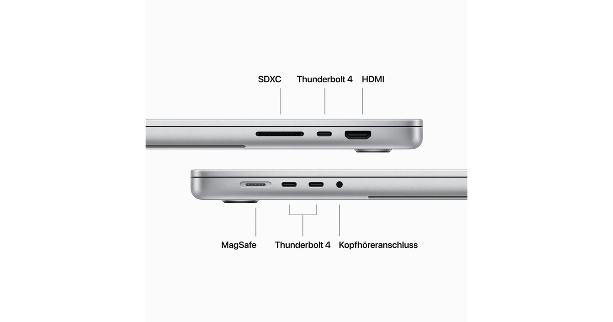 Das MacBook Pro macht einen gigantischen Performance-Sprung mit dem M3 Pro Chip. Entwickelt mit 3 Nanometer Technologie und mit einer ganz neuen GPU-Architektur ist er einer der fortschrittlichsten Chips, der je für einen Personal Computer gebaut wurde. Mit der neuen Generation von Appels Prozessoren kommt auch eine neue Klasse von GPU-Architektur und der bisher größte Sprung bei der Grafik für Apple Chips. Dynamisches Caching optimiert den schnellen Arbeitsspeicher auf dem Chip, um die durchschnittliche GPU-Nutzung deutlich zu steigern. Das bringt einen massiven Performance-Schub für die anspruchsvollsten Pro Apps und Games. Durch Hardware beschleunigtes Mesh Shading und Raytracing sehen Spiele detaillierter aus als je zuvor. Trotz der beeindruckenden Performance geht dem MacBook so schnell nicht die Puste aus. Durch die effiziente CPU-Architektur und den großen Akku erreicht es eine Laufzeit von bis zu 18 Stunden. Auf dem brillanten Liquid Retina XDR Display sind Bilder unglaublich detailliert und realistisch. Text ist gestochen scharf und klar. Die helle Mini-LED Hintergrund-Beleuchtung sorgt für tiefes Schwarz und helles Weiß. Ein großer P3 Farbraum ermöglicht noch satteres Grün und Rot als sRGB. Der extreme Dynamikbereich (XDR) sorgt für verbesserte Spiegelglanzlichter, unglaubliche Details in Schatten und brillante, lebensechte Farben. Jedes Liquid Retina XDR Display wurde werkseitig kalibriert und kommt mit ProMotion und Voreinstellungen für Pros. Das aktuelle macOS wurde entwickelt, um das Potenzial des M3 Pro Chips optimal zu nutzen, und ermöglicht dem MacBook Pro eine deutlich höhere Performance und noch viel mehr. Leistungsstarke Updates für Apps. Ein beeindruckendes neues Design. Branchenführende Funktionen für Datenschutz und erstklassige Sicherheit. Mit dem Magic Keyboard kann man alles schneller und effizienter machen. Die Scherenmechanik sorgt dafür, dass man angenehm und leise tippen kann. Touch ID ermöglicht eine schnelle und einfache Authentifizierung für sichere Logins und Einkäufe.Art.-Nr.: 100023242