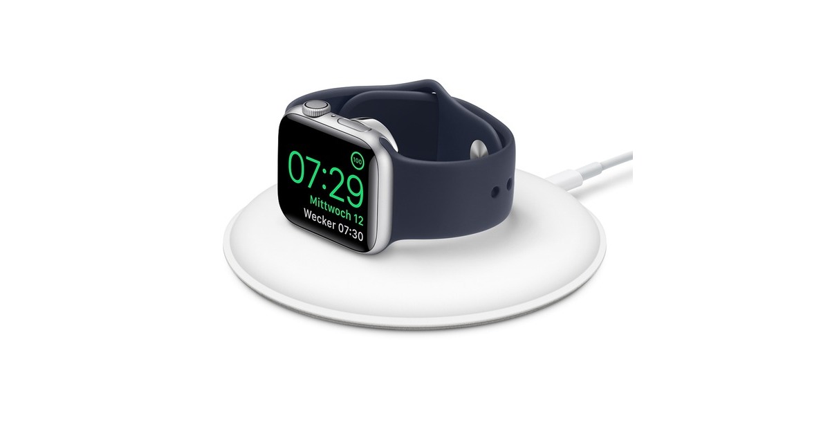 Mit dem magnetischen Apple Watch Ladedock kann man die Apple Watch flach liegend mit offenem Armband oder seitlich liegend aufladen. Beim Aufladen wechselt die Apple Watch automatisch in den Weckermodus und man kann sich von ihr wecken lassen. Das magnetische Apple Watch Ladedock verwendet den gleichen induktiven Connector zum Aufladen, der bei der Apple Watch dabei ist. Und es wird über das Lightning auf USB Kabel und den Apple 5W USB Power Adapter verbunden.Art.-Nr.: 1504622