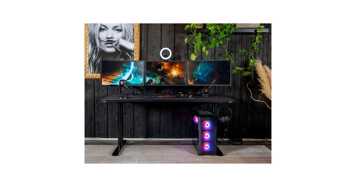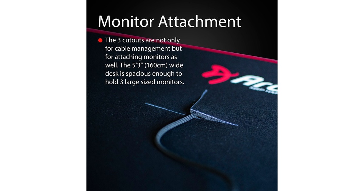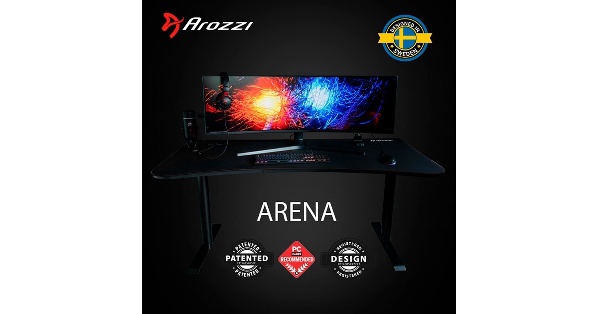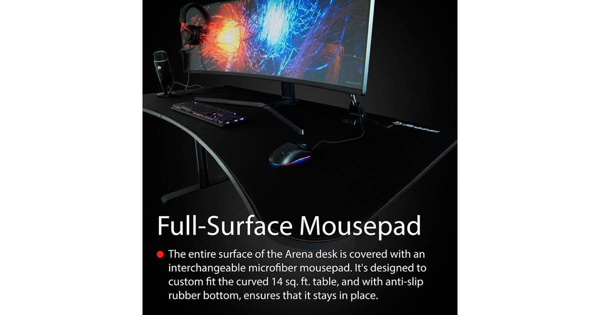 Der Arozzi Arena Gaming-Desk "Pure Black" ist ein hochwertiger Gaming-Tisch mit viel Platz, außergewöhnlichem Kabelmanagementsystem und einem maßgefertigten 5mm dicken Mauspad mit umgenähten Kanten. Die gesamte Oberfläche des Tisches ist mit dem austauschbaren Mikrofaser-Mauspad bedeckt. Das Mauspad wurde speziell für den 1,31m² großen, geschwungenen Arena Gaming-Tisch entwickelt und verfügt über eine rutschfeste Gummiauflage. Das vollflächige Mauspad ist außerdem wasserabweisend und einfach zu reinigen. Sollte eine gründlichere Reinigung gewünscht sein, kann man es einfach bei niedriger Temperatur in der Waschmaschine waschen und anschließend an der Luft trocknen. Der Arena Gaming-Tisch verfügt über drei Aussparungen in Tisch- und Mauspad-Oberfläche, die nicht nur der effizienten Kabelführung, sondern auch der Befestigung von Monitorständern dienen. Mit einer Gesamtbreite von 160cm bietet der Schreibtisch ausreichend Platz für bis zu drei große Monitore gleichzeitig. Der Arena Gaming-Tisch steht auf stabilen Stahlbeinen, die bis zu 10cm höhenverstellbar sind. Verstellbare Füße ermöglichen eine Anpassung auch an unebene Böden. Arozzi hat den in vielen Farben erhältlichen Arena entwickelt, um das Gaming- und Computererlebnis mit nützlichen Funktionen, robusten, langlebigen Materialien zu optimieren.Art.-Nr.: 1740336