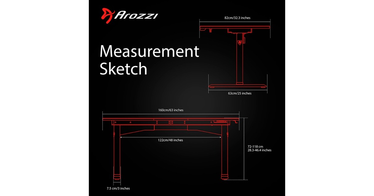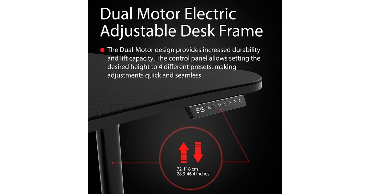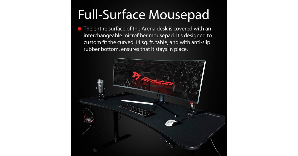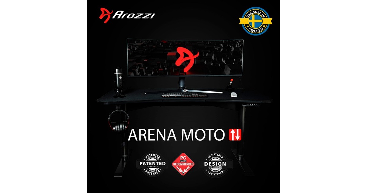 Der Arozzi Arena Moto ist die motorisierte Version des originalen Arozzi Arena Gaming Desk. Der Arena Moto ist ein hochwertiger Gaming-Tisch mit viel Platz, außergewöhnlichem Kabelmanagement-System und einem maßgefertigten 5mm dicken Mauspad mit umgenähten Kanten. Die gesamte Oberfläche des Tisches ist mit dem austauschbaren Mikrofaser-Mauspad bedeckt. Das Mauspad wurde speziell für den 1,31m² großen, geschwungenen Arena Gaming-Tisch entwickelt und verfügt über eine rutschfeste Gummiauflage. Das vollflächige Mauspad ist außerdem wasserabweisend und einfach zu reinigen. Sollte eine gründlichere Reinigung gewünscht sein, kann man es einfach bei niedriger Temperatur in der Waschmaschine waschen und anschließend an der Luft trocknen. Der Arena Gaming-Tisch verfügt über drei Aussparungen in Tisch- und Mauspad-Oberfläche, die nicht nur der effizienten Kabelführung, sondern auch der Befestigung von Monitorständern dienen. Mit einer Gesamtbreite von 160cm bietet der Schreibtisch ausreichend Platz für bis zu drei große Monitore gleichzeitig. Studien deuten übrigens darauf hin, dass ein Wechsel vom Sitzen zum Stehen viele gesundheitliche Vorteile hat und die Produktivität steigern kann. Mit den vier nummerierten Tasten der Bedieneinheit kann man die verschiedenen Höhen, auf die man den Tisch einstellen möchte, speichern. Sobald man eine der vier Tasten gedrückt hält, wird der Tisch genau auf diese Höhe angehoben oder abgesenkt. Um jegliche Form von Instabilität aufgrund der möglichen Höhe des Tisches zu vermeiden, wurde eine Querverstrebung zwischen den beiden Tischbeinen integriert. Im Lieferumfang des Arena Moto ist außerdem eine Headset-Halterung enthalten, die rechts oder links unter dem Tisch angebracht werden kann, je nachdem, wo sich der Monitor befindet.Art.-Nr.: 1740342