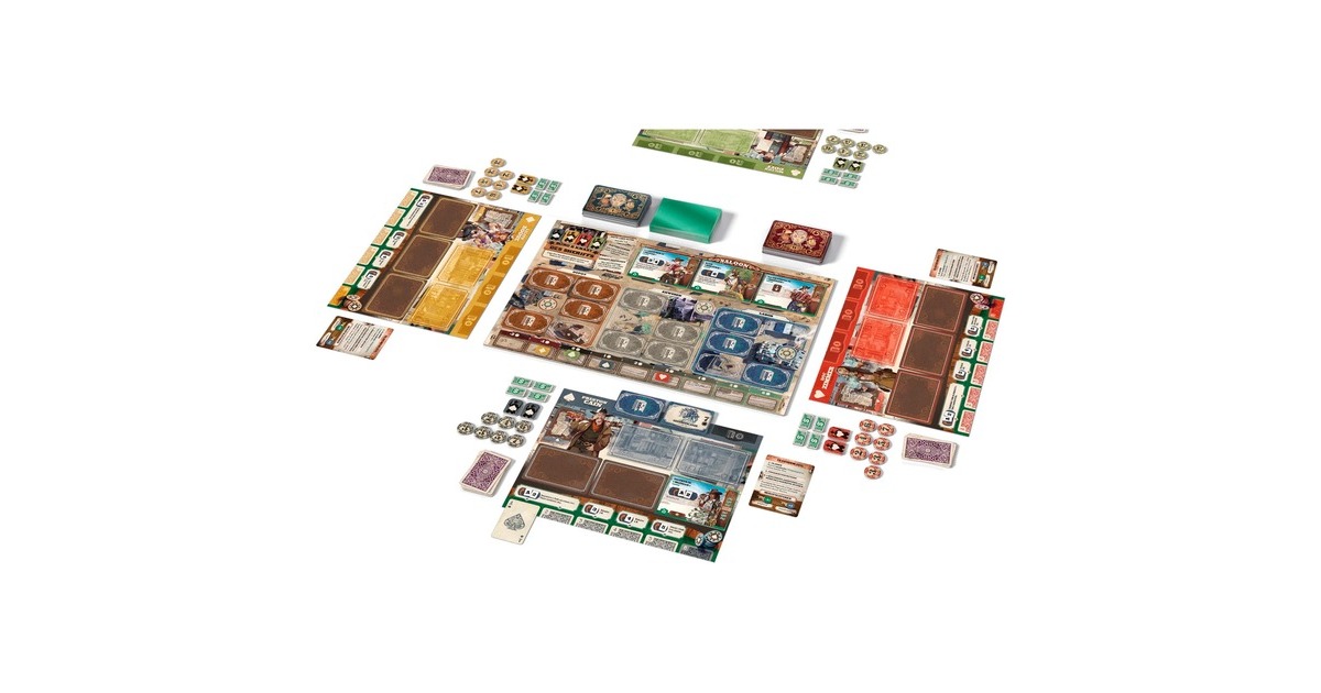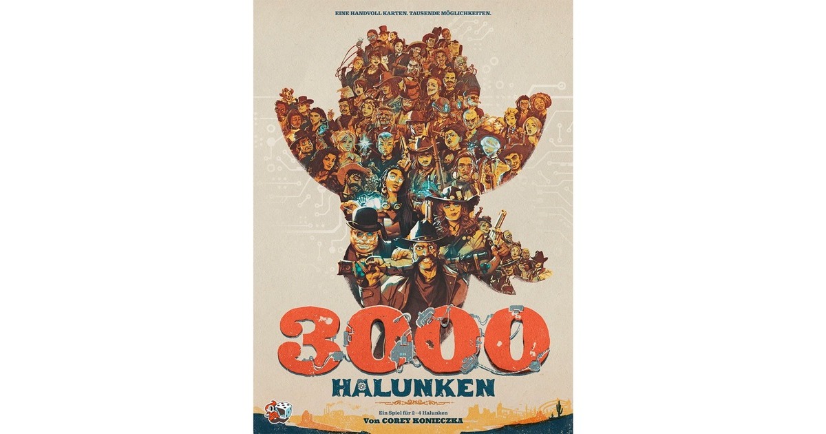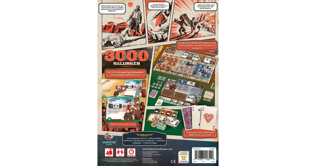 Das Strategiespiel 3000 Halunken verbindet auf äußerst unterhaltsame die Themen Wilder Westen und Science Fiction. Dabei führt jeder der 2-4 Spieler eine Bande von Halunken an, die die zurückgelassenen Technologien eines mysteriösen Reisenden sammelt. Doch sie müssen schnell sein, dann bald werden die Regierungsvertreter hier sein und alles einsammeln! Um das Spiel zu gewinnen, werden Halunken angeheuert und deren einzigartige Fähigkeiten genutzt. Jeder Halunke setzt sich aus drei Teilen zusammen: Einer transparenten Jobkarte, einer Eigenschaftskarte und einer Kartenhülle. Es gibt 3000 verschiedene Kombinationsmöglichkeiten für die Halunken, wodurch jede Partie einzigartig wird. Die wertvollen technologischen Gerätschaften des Reisenden sollen Gerüchten zufolge sicher in Safes verwahrt sein, die im Depot, im Anwesen des Reisenden und in seinem geheimen Labor zu finden sein sollen. Jeder Safe, den ein Spieler stiehlt, ist am Spielende Techpunkte wert. Wer am Ende des Spiels die meisten Techpunkte gesammelt hat, gewinnt und entscheidet über das Schicksal des Wilden Westens!Art.-Nr.: 1902090