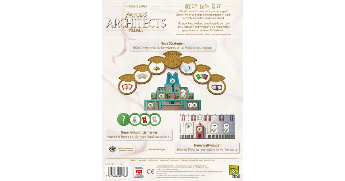 Strebt nach Ruhm und Anerkennung in der Welt der Antike mit der Erweiterung Medals für 7 Wonders Architects. Ergänzt euer Grundspiel um spannende Aspekte und zwei neue Wunder - das majestätische Kolosseum von Rom und die mystische Zikkurat von Ur - die eure Strategie bereichern und das Baufieber zusätzlich anheizen werden. Mit den neuen Fortschrittsmarkern könnt ihr eure Fortschritte noch genauer verfolgen. Tauscht geschickt Medaillen mit euren Sitznachbarn aus, und seid die Ersten, die die Ziele auf der Medaille erreichen. Die Medaillen zwingen dazu, eure Taktik zu verfeinern und mit Bedacht zu handeln. Für diejenigen, die sich als Experten betrachten, wartet im Spiel noch eine Zusatzherausforderung mit zwei weiteren Medaillen. Neue Dimensionen der Strategie eröffnen sich, doch das fesselnde Ziel bleibt gleich: Baut eines der sieben Weltwunder und führt eure Zivilisation zum Sieg! Wagt es, Geschichte zu schreiben!Art.-Nr.: 100044752