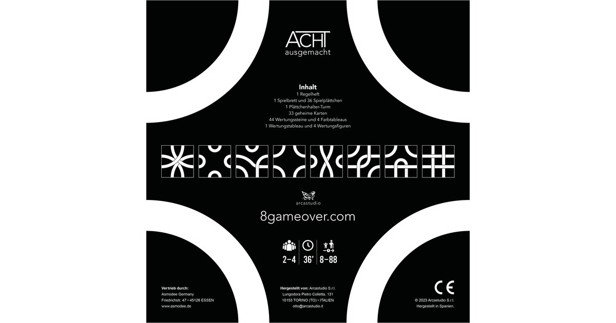 ACHT: ausgemacht ist ein abstraktes Spiel, das mit seinem originellen Design überzeugt. Ziel des Spiels ist es, durch geschicktes Legen seiner Plättchen 24 Punkte zu erzielen. Der Reiz von ACHT: ausgemacht liegt darin, dass die schwarz-weißen Muster aller Plättchen miteinander verbunden werden können, es also unendliche Kombinationsmöglichkeiten gibt. Punkte werden erzielt, indem Formen wie Kreise oder Quadrate geschlossen werden. Wem es gelingt, eine 8 - das Symbol der Unendlichkeit - auf dem Spielbrett zu bilden, erhält sogar acht Punkte für die Runde, während seine Mitspieler leer ausgehen.Art.-Nr.: 1902157