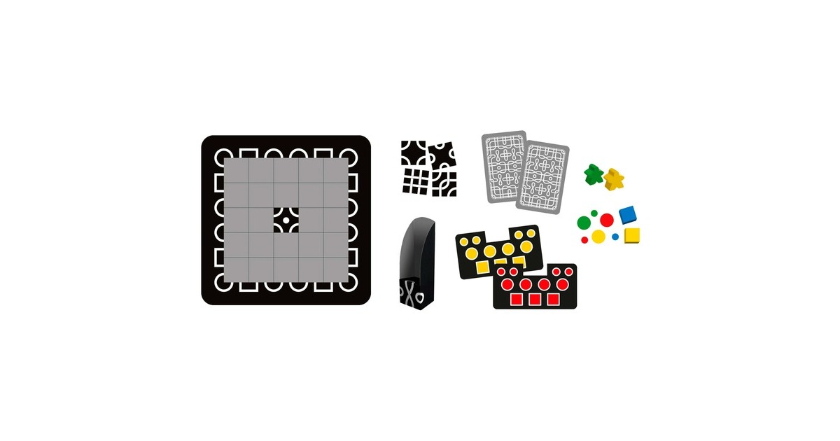 Regelheft, Spielbrett, 36 Spielplättchen, 1 Plättchenhalter-Turm, 33 Geheime Karten, 44 Wertungssteine, 4 Farbtableaus, 1 Wertungstableau, 4 Wertungsfiguren |