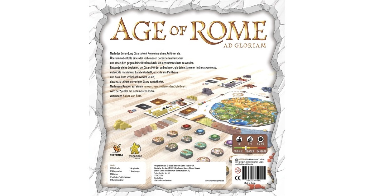 Nach dem Fall Cäsars ringt Rom um Stabilität. In "Age of Rome" schlüpfst du in die Rolle eines von sechs Anwärtern auf die Führung des Imperiums. Setze dich in diesem strategisch anspruchsvollen Spiel gegen deine Widersacher durch und erlange unsterblichen Ruhm. Nutze das rotierende Spielbrett zu deinem Vorteil, um durch kluges Timing deine Legionen zu befehligen, im Senat Einfluss zu nehmen und deine Macht in Handel und Landwirtschaft auszubauen. Baue monumentale Bauwerke und stelle Roms Glanz wieder her. Mit einer Mischung aus taktischer Vielfalt und historischem Flair bietet "Age of Rome" eine spannende Herausforderung für Solo-Spieler wie auch Gruppen. Werde zum Architekten eines neuen Zeitalters: Nach neun Runden voller Intrigen und Strategie krönt der Ruhm den würdigsten Spieler zum neuen Kaiser. Bist du bereit für die Krone Roms?Art.-Nr.: 100044765