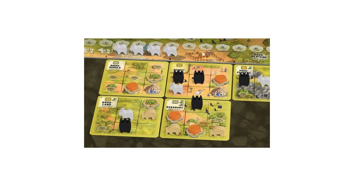 Aktionsplan, 2 Aktionsplanerweiterungen (doppelseitig), 52 Familienmarken, 44 Verschmutzungsmarken (doppelseitig), 6 Aktionsfeldtafeln, 4 Vorratstableaus, 52 Baummarken, 40 Goldmarken, 1 Startmarke, 36 Ortschaftskarten, 12 Übersichtskarten, 36 Landschaftskarten, 4 Nachtkarten, 12 Figuren aus Holz, 32 Fruchtmarken aus Holz, 32 Buschtiermarken aus Holz, 28 Ziegenmarken aus Holz, 96 Flughundmarken aus Holz, 1 Wertungsblock, Anleitung |