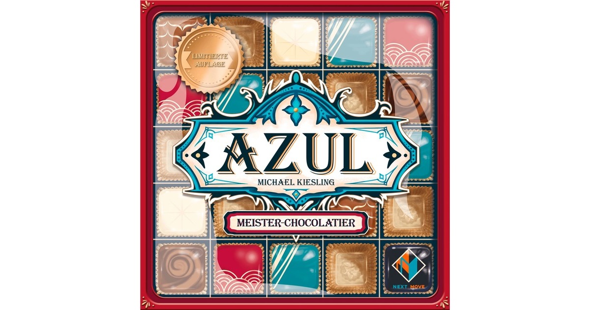 Azul: Meister-Chocolatier ist eine Sammleredition des Spiele-Bestsellers Azul. Hier geht es darum, möglichst begehrte Pralinen-Sortimente zu erstellen. Die Spielregen entsprechen denen des Original-Azuls, doch die angepasste Optik mit Pralinen statt Fliesen bringt jeden Schokoladen-Fan ins Schwärmen. Die hochwertige Ausstattung des Spielmaterials ist dabei wie beim Original erstklassig. Diese Sammleredition bietet außerdem fünf verschiedene Sonder-Manufakturplättchen, was für noch mehr Spielvariationen sorgt.Art.-Nr.: 1901715