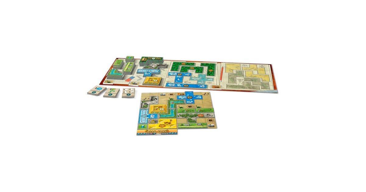 16x Parkgelände, 52x Grünanlagen, 12 Außengehege, 28 Tierhäuser, 16 Bärenstatuen, 30 Auftragsplättchen, 1 Vorratsplan, 2 Regelhefte (DE/EN) |