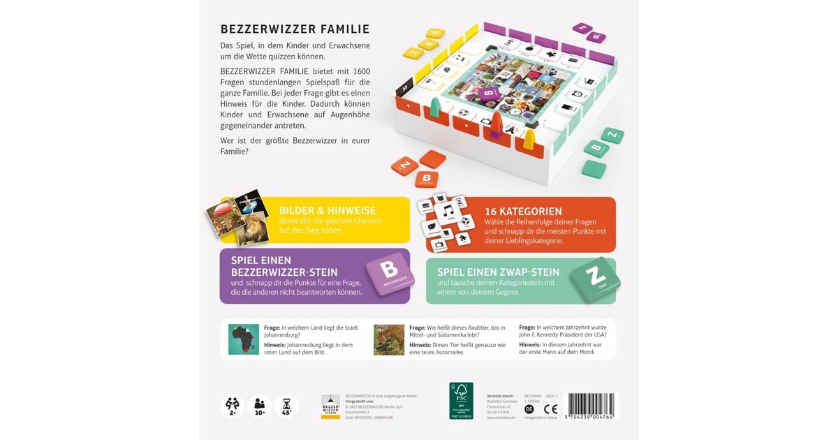 Testet euer Wissen und spielt die familienfreundliche Version eines bekannten Quizspiels: "Bezzerwizzer Familie"! Herausfordernde Fragen treffen auf eine bunte Mischung aus Themen - hier wird jeder zum Quizmeister. Stellt euch 1600 faszinierenden Fragen aus 16 Kategorien, angepasst für Groß und Klein mit hilfreichen Hinweisen für die jüngeren Spieler. In "Bezzerwizzer Familie" spielen alle auf Augenhöhe und Wissen wird spielend zwischen den Generationen ausgetauscht. Ob Weltpolitik, Naturwissenschaften oder doch Popkultur - wählt eure Lieblingskategorien weise, um möglichst viele Punkte zu erzielen. Nutzt strategische Hilfsmittel wie den ZWAP-Stein zum Tauschen der Kategorien oder den Bezzerwizzer-Stein, um zusätzliche Punkte bei den Fragestellungen der Gegner zu ergattern. Die interaktive Komponente sorgt für zusätzlichen Nervenkitzel und hält das Spiel bis zur letzten Runde spannend. Mit "Bezzerwizzer Familie" kommt Spaß und Wissensvertiefung zusammen auf den Tisch. Ein Spiel, das die Köpfe rauchen lässt und dabei zeigt, wer das größte Quizgenie in der Familie ist!Art.-Nr.: 100044889