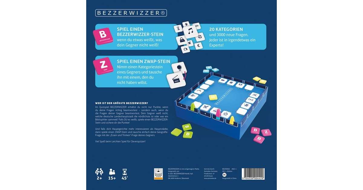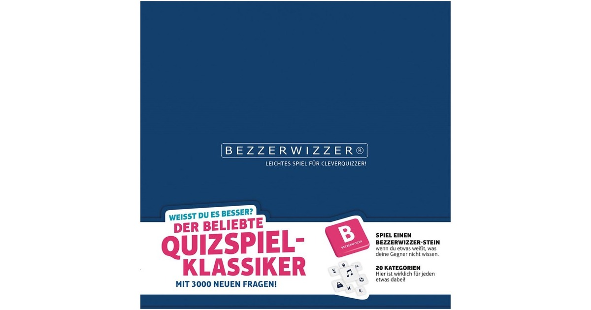 Bezzerwizzer – leichtes Spiel für Cleverquizzer. Ein absolut innovatives Quizspiel, denn die Spieler können beeinflussen, welche Fragen sie und ihr Team bzw. die gegnerische Mannschaft beantworten müssen. Der Clou: Neben Wissen spielen Strategie und Taktik mit. Sport ist nicht Ihr Ding? – Kein Thema! Dank Bezzerwizzer- und Swap-Steinen können Fragenkategorien getauscht und Zusatzpunkte erspielt werden. 3.000 Fragen aus 20 Wissensgebieten bieten jede Menge Abwechslung.Art.-Nr.: 1727371