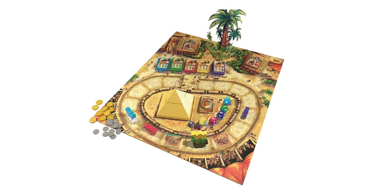 | Inhalt/Ausstattung | Spielplan mit 3D-Palmen Pop-Up, 20 Wettscheine, 5 Pyramidenscheine, 80 Münzen, 40 Zielkarten, 8 Zuschauerplättchen, 8 Partnerkarten, 5 Rennkamele, 5 Rennwürfel, 2 verwirrte Kamele, 1 grauer Würfel, 1 Startspieler-Marker, 1 Würfelpyramide |