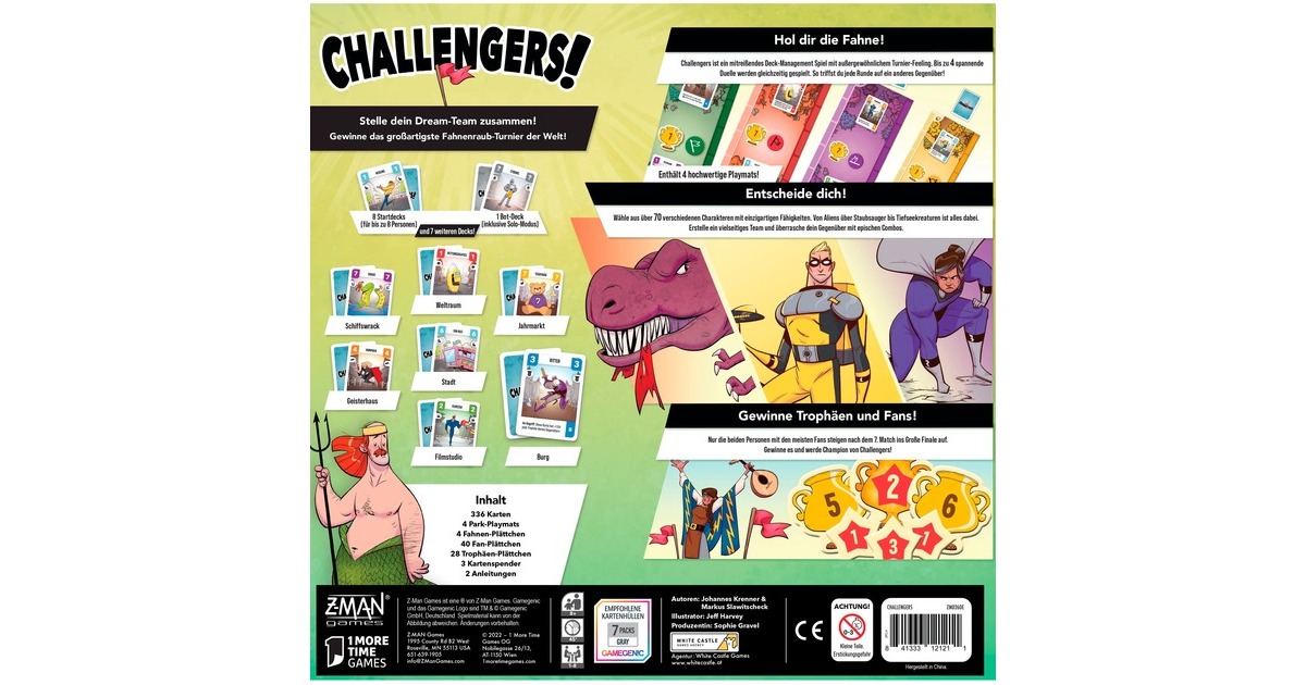 Challengers! ist ein spannendes Deck-Management-Spiel, das außergewöhnliches Turnierfeeling bietet. Es können bis zu vier spannende Duelle gleichzeitig gespielt werden, so dass in jeder Runde ein anderes Gegenüber wartet. Dabei kann aus über 70 verschiedenen Charakteren mit individuellen Fähigkeiten gewählt werden: Ob Aliens, Staubsauger oder Tiefseekreaturen - so gut wie alles ist dabei. Das vielseitigste Team mit den tollsten Kombinationen gewinnt Trophäen und Fans!Art.-Nr.: 1909800