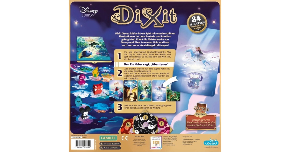 Lasst den Vorhang aufgehen für ein Spiel voller Fantasie und Zauber: "Dixit: Disney Edition"! In diesem bezaubernden Spiel verschmilzt die kreative Welt von Dixit mit dem unvergesslichen Charme der Disney- und Pixar-Geschichten. Jede Karte offenbart ein kleines Kunstwerk, das euch direkt in die grenzenlosen Welten von Disneys Meisterwerken entführt. Die "Dixit: Disney Edition" bewahrt das klassische Dixit-Spielprinzip, bei dem eure Intuition und Fantasie das Zentrum eines jeden Zuges bilden. Als Geschichtenerzähler verzaubert ihr eure Mitspieler mit Hinweisen, die zu einer geheimnisvollen Karte aus eurer Hand passen - zum Beispiel mit einem Wort, einem Satz oder sogar mit einem Lied. Dann versuchen alle, die Hinweise mit ihren eigenen Karten zu reflektieren, bis ein bunter Kartenreigen aus Disney-Motiven auf dem Tisch liegt. Mit 84 Bildkarten und sechs bezaubernden Disney-Charakter-Meeplen wird jeder Spielzug zu einer Reise durch die Fantasie. Punkte sammeln beim Erraten der Erzähler-Karte oder die Mitspieler listig in die Irre führen - "Dixit: Disney Edition" ist ein Fest für Kreative und ein Muss für jeden Disney-Liebhaber, das Groß und Klein gleichermaßen verbindet.Art.-Nr.: 100044931