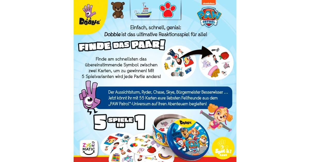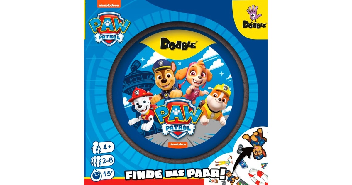 Der Aussichtsturm, Ryder, Chase, Skye, Bürgermeister Besserwisser: Jetzt können Kinder ab 4 Jahren mit 55 Karten ihre liebsten Fellfreunde aus dem Universum von Paw Patrol auf ihren Abenteuern begleiten. Und wer schnell ist, gewinnt bei diesem Spiel: Dobble ist ein kartenbasiertes Reaktionsspiel mit fünf verschiedenen Spielvarianten. Bei allen Varianten geht es darum, als Erster das auf zwei Karten übereinstimmende Symbol zu finden und es dann laut zu benennen. Aber Achtung: Form und Farbe eines Symbols sind immer gleich, doch die Größe kann unterschiedlich sein.Art.-Nr.: 100010725