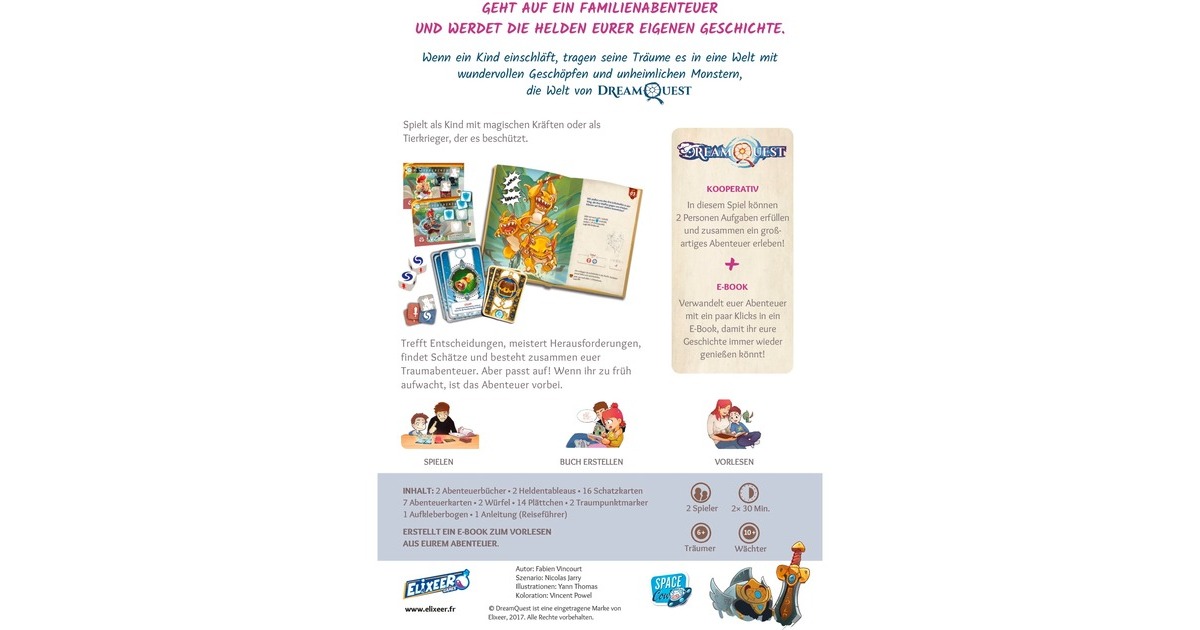DreamQuest ist ein kooperatives Eltern-Kind-Abenteuer, das zwei Spieler gemeinsam erleben. Sie schlüpfen in die Rolle zweier Helden. Die Träumerin ist ein Kind mit magischen Fähigkeiten. Der Hüter ist ein mächtiger Tiermensch, der die Träumerin auf ihrer Reise beschützt. Das Besondere an DreamQuest ist, dass beim Spielen ein eigenes Buch entsteht, das später immer wieder gelesen werden kann. Zunächst wird das Abenteuer gemeinsam gespielt, in dem gefährliche Kreaturen besiegt, Schätze gefunden und gemeinsam Entscheidungen getroffen werden müssen, die den Verlauf der Geschichte beeinflussen. Anschließend kann das Abenteuer als E-Book gespeichert werden.Art.-Nr.: 1902167