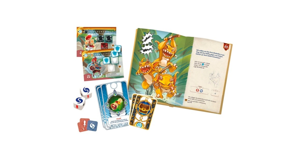 2 Abenteuerbücher, 2 Heldentableaus, 16 Schatzkarten, 7 Abenteuerkarten, 2 Würfel, 14 Plättchen, 2 Traumpunktmarker, 1 Aufkleberbogen, 1 Anleitung |