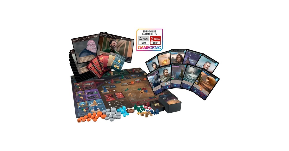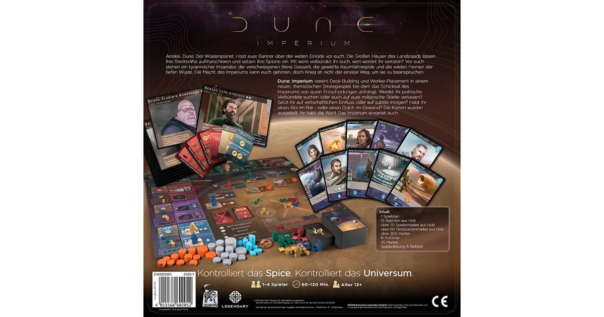 Hisst euer Banner über der weiten Einöde vor euch. Die großen Häuser des Landsraad lassen ihre Streitkräfte aufmarschieren und setzen ihre Spione ein. Mit wem wollt ihr euch verbünden, wen wollt ihr verraten? Vor euch stehen ein tyrannischer Kaiser, die verschwiegenen Bene Gesserit, die gewiefte Raumfahrergilde und die wilden Fremen der tiefen Wüste. Die Macht des Imperiums kann euch gehören, doch Krieg ist dabei nicht der einzige Weg, um sie zu beanspruchen. Dune: Imperium vereint Deck-Building und Worker Placement in einem neuen, thematischen Strategiespiel, bei dem das Schicksal des Imperiums von euren Entscheidungen abhängt.Art.-Nr.: 1727425
